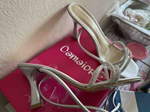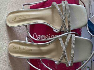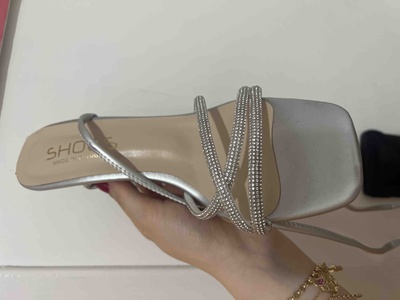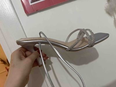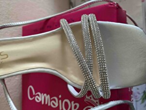 Kadın Gümüş Taşlı Bilekten Ipli Bağlamalı Biyeli Topuklu Ayakkabı Kadın Gümüş Taşlı Bilekten Ipli Bağlamalı Biyeli Topuklu Ayakkabı DEMA0117 40