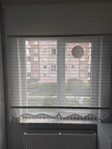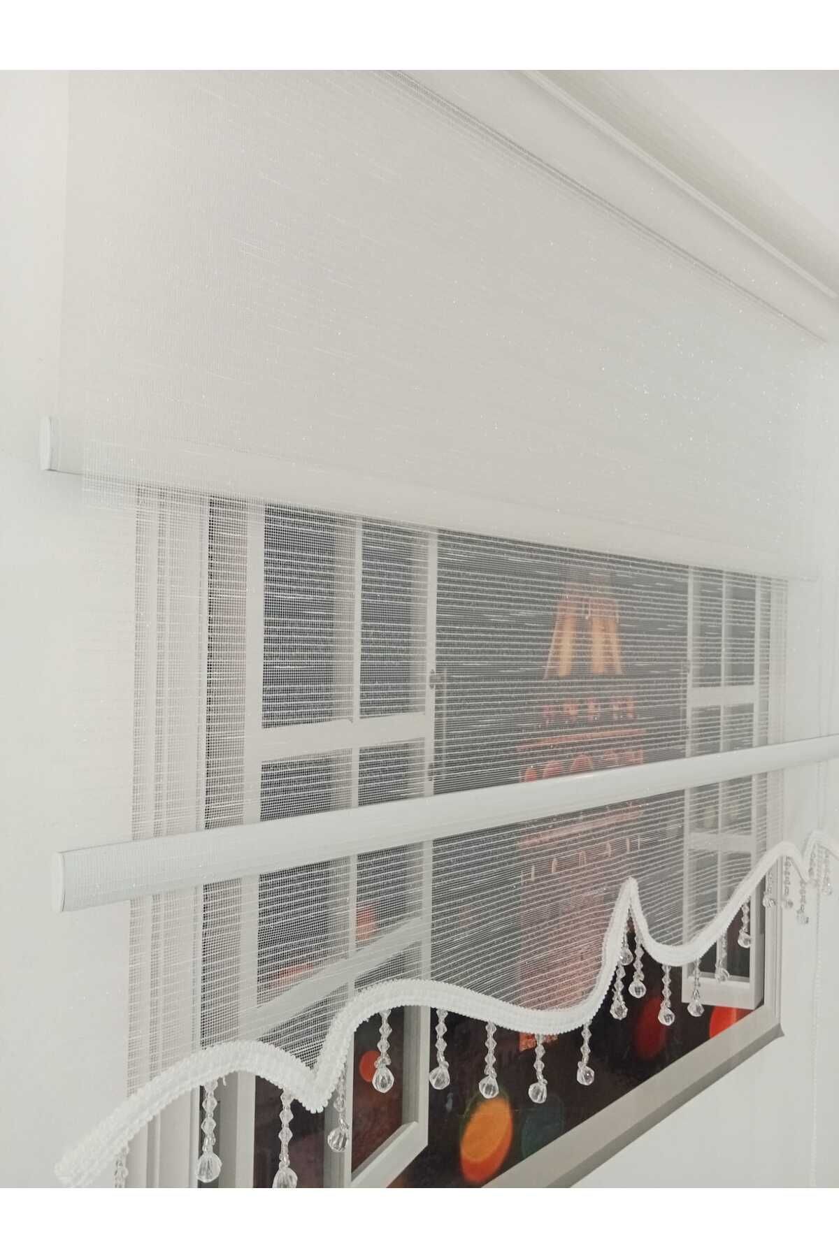 Çift Mekanizmalı Boncuklu Gri Serit Desenli Tül, Beyaz Poyester Stor Perde Çift Mekanizmalı Boncuklu Gri Serit Desenli Tül, Beyaz Poyester Stor Perde ÇS2022 270 x 260
