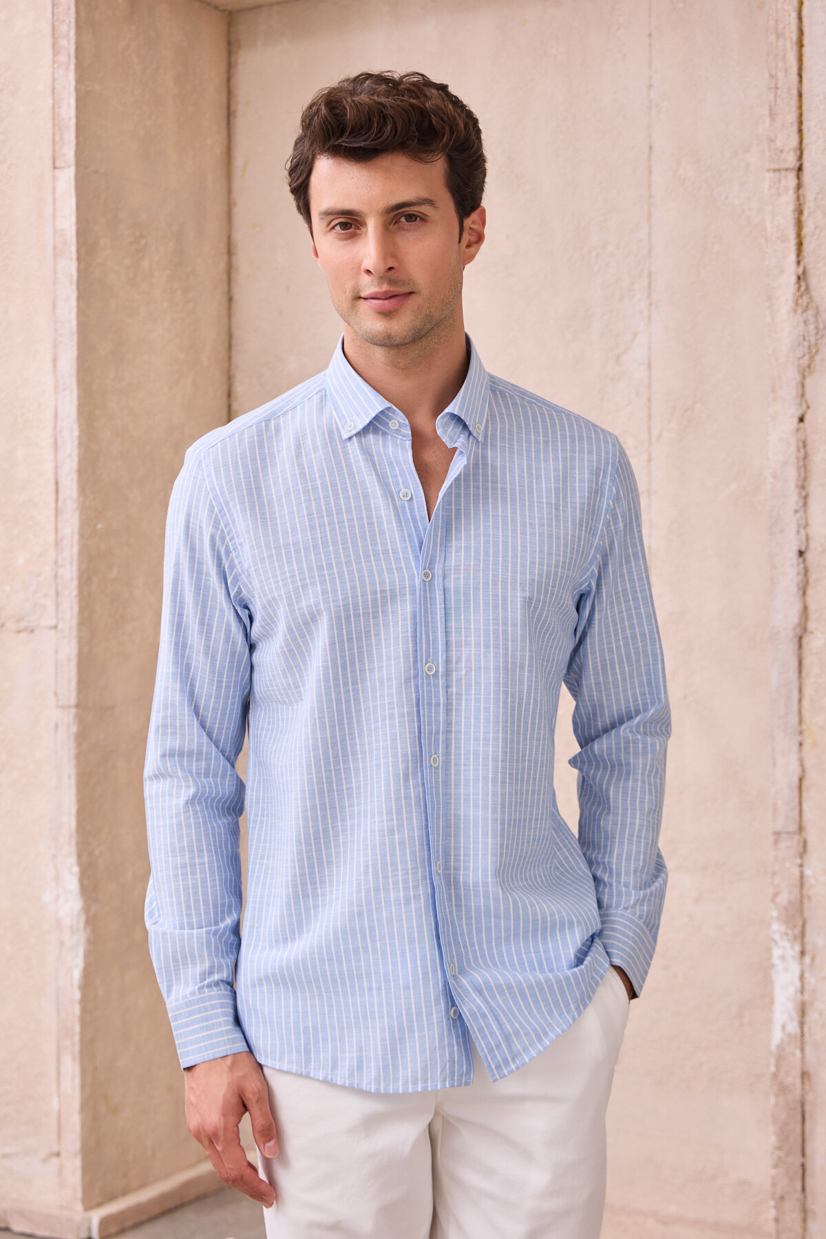 Erkek Mavi Slim Fit Uzun Kollu Keten Gömlek Erkek Mavi Slim Fit Uzun Kollu Keten Gömlek W35000T XL