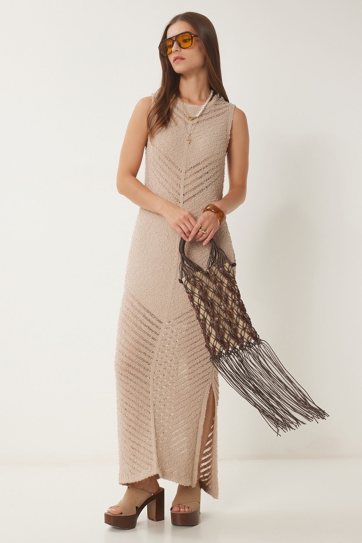 Kadın Krem Askılı V Yaka Ajurlu Yazlık Triko Elbise NF00049 Kadın Krem Askılı V Yaka Ajurlu Yazlık Triko Elbise NF00049 S/M