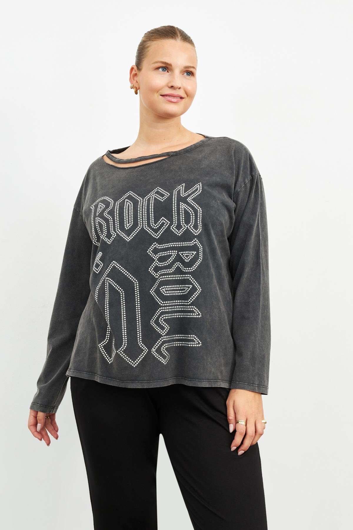 Bol Kesim Crystal Taşlı Büyük Beden Bisiklet Yaka Pamuk Siyah Kadın T-shirt Bol Kesim Crystal Taşlı Büyük Beden Bisiklet Yaka Pamuk Siyah Kadın T-shirt 772 4XL