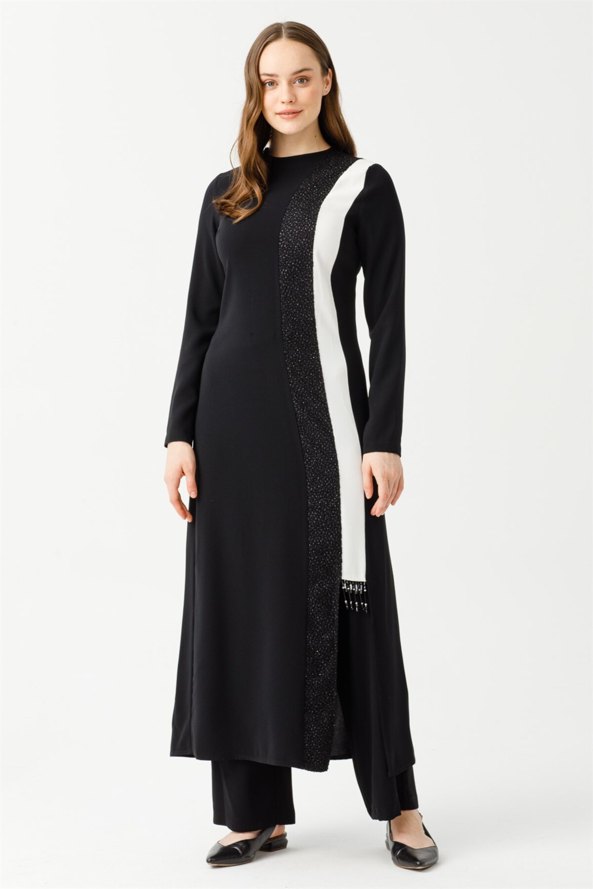 Kolu Piliseli Önden Yırtmaçlı Şerit Taş Detaylı Pantolonlu Takım Taş Kolu Piliseli Önden Yırtmaçlı Şerit Taş Detaylı Pantolonlu Takım Taş 2317352303 52