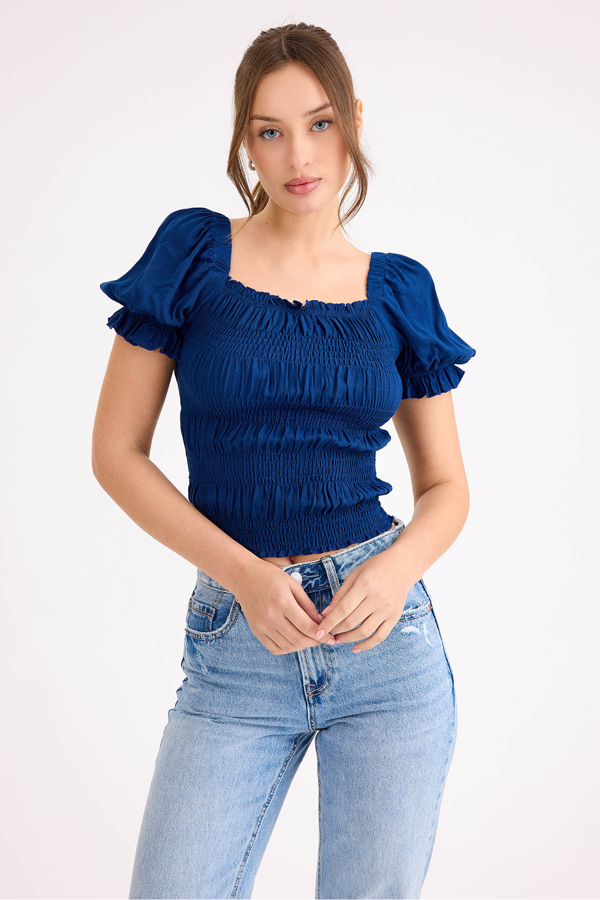 Kadın Gök Mavi Çiçekli Büzgü Yakalı Örme Crop Bluz HK00021 Kadın Gök Mavi Çiçekli Büzgü Yakalı Örme Crop Bluz HK00021 42