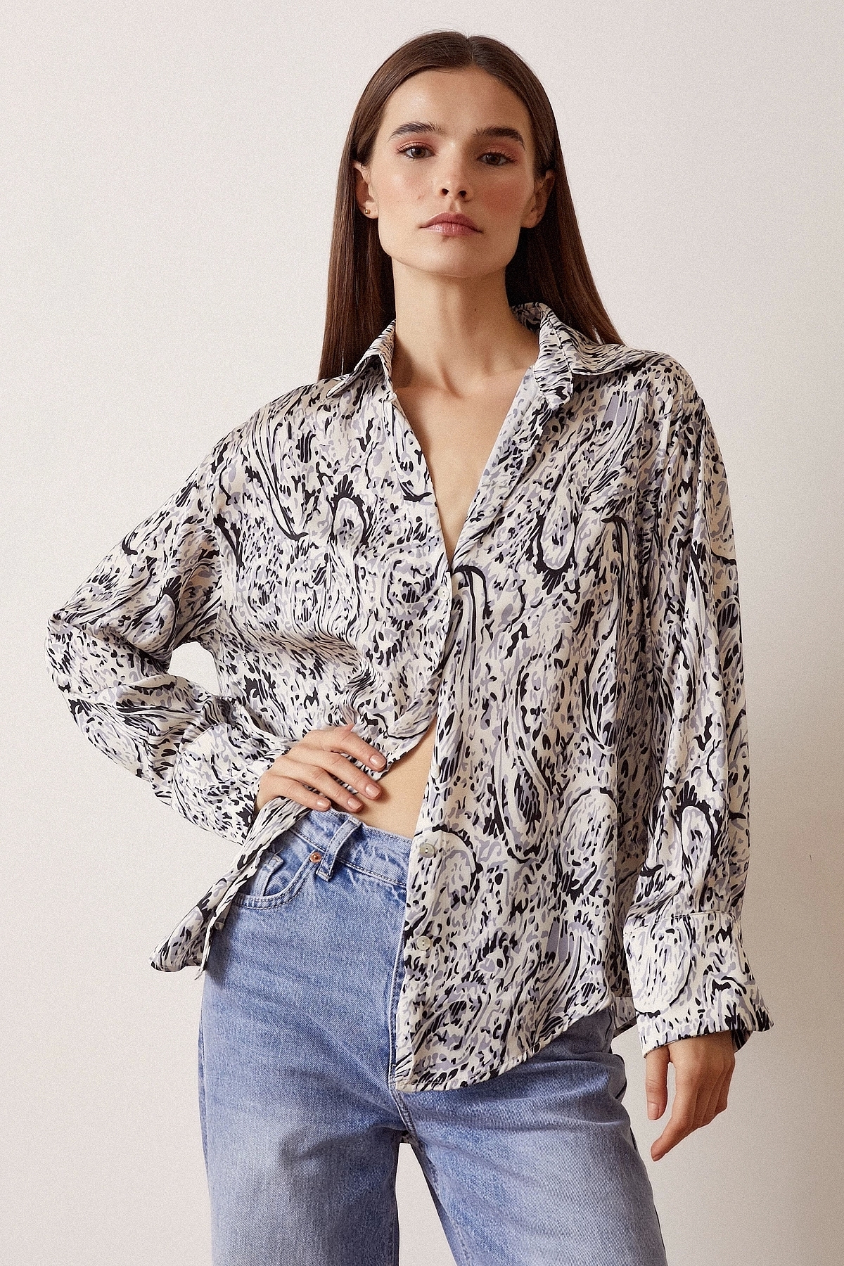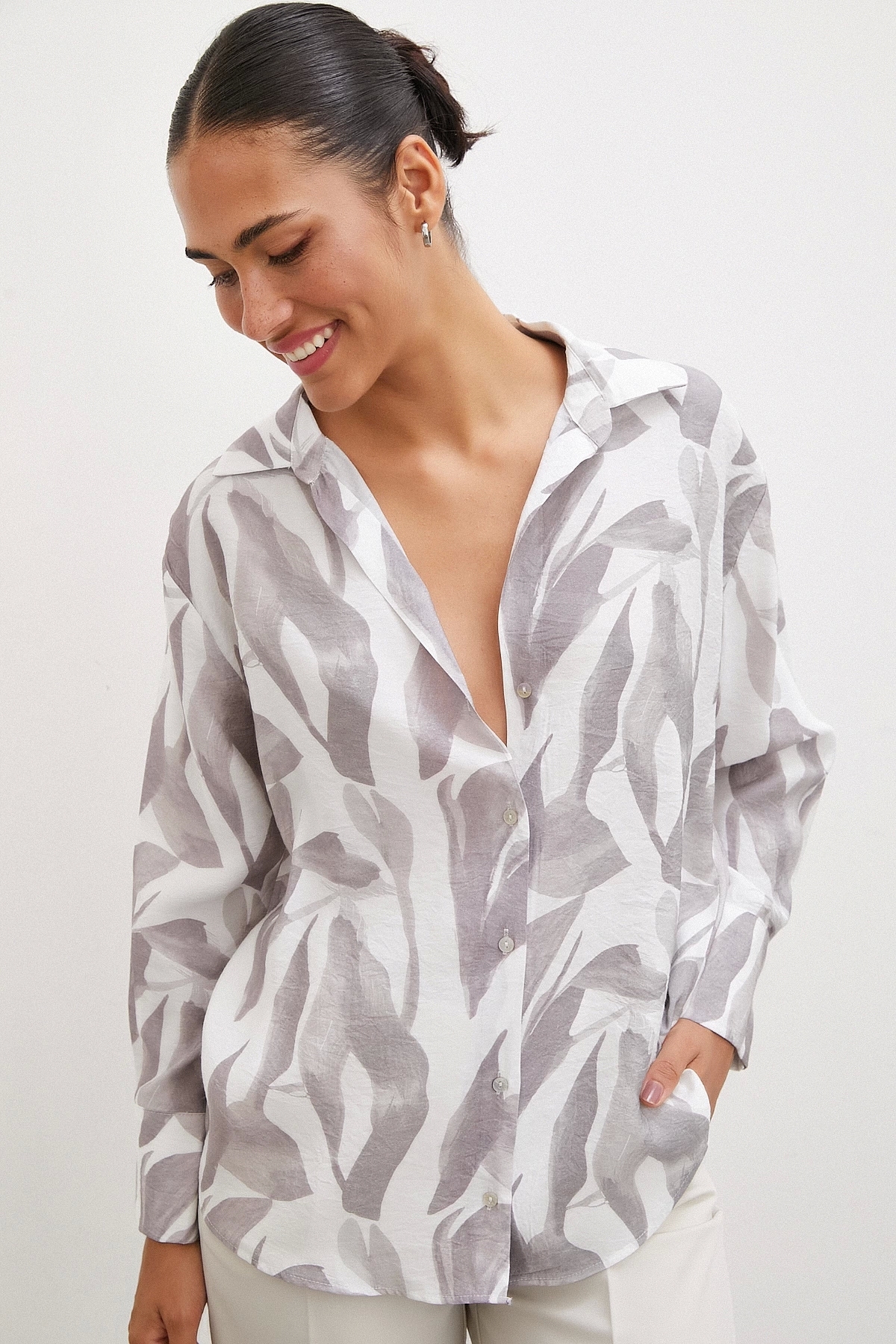 V Yaka Desenli Saten Gömlek V Yaka Desenli Saten Gömlek NM23S101501 L