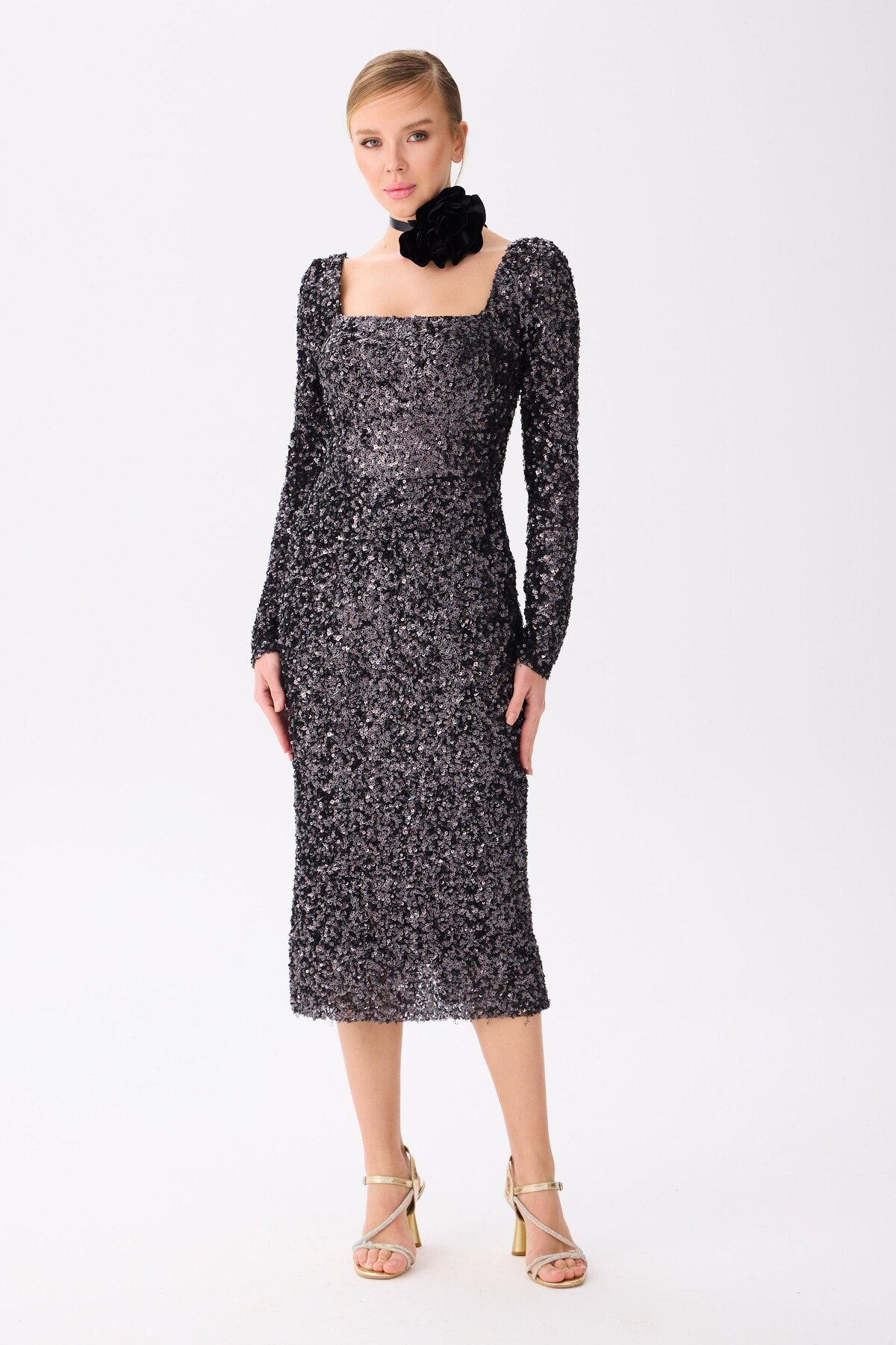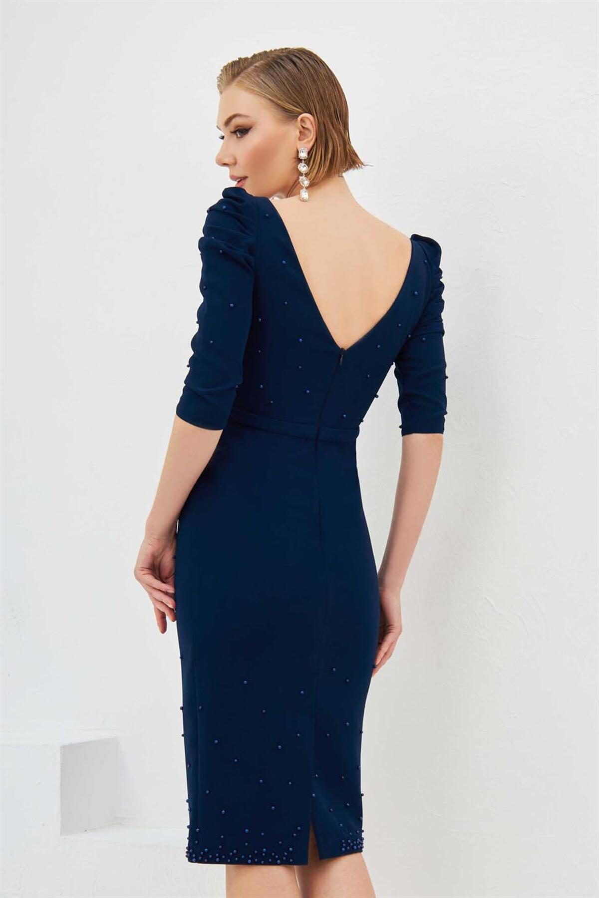 Lacivert Krep İnci İşlemeli Midi Abiye Elbise Lacivert Krep İnci İşlemeli Midi Abiye Elbise 58154 42