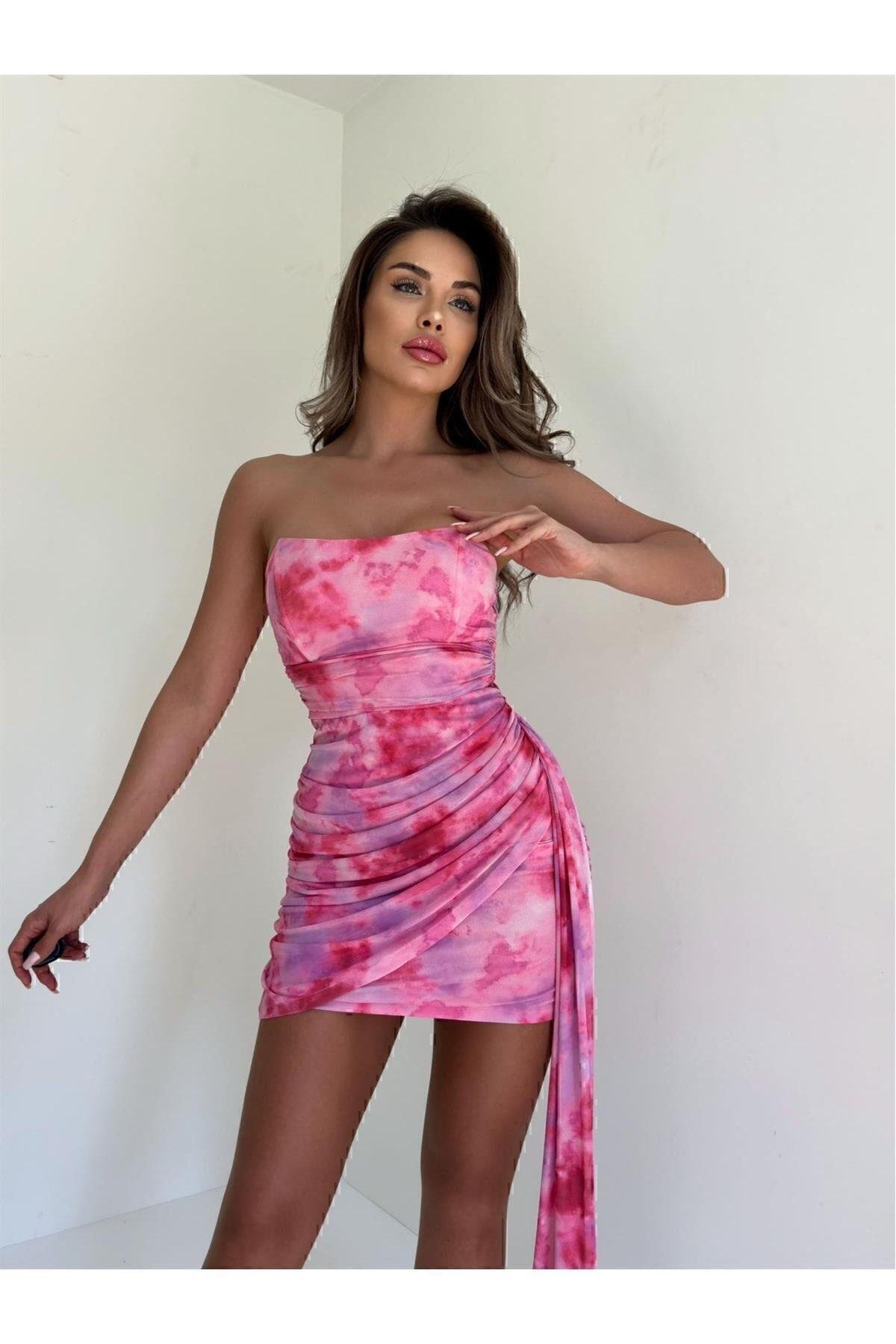 Kadın Pembe Desenli Drapeli,sarkıt Kumaş Detaylı, Straplez, Dekolte, Mini Abiye & Mezuniyet Elbisesi Kadın Pembe Desenli Drapeli,sarkıt Kumaş Detaylı, Straplez, Dekolte, Mini Abiye & Mezuniyet Elbisesi MSCX07 L
