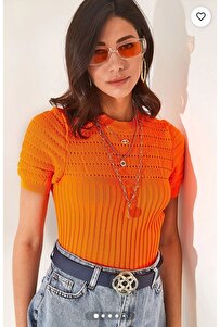 Kadın Turuncu Üstü Ajurlu Fitilli Triko Bluz BLZ-19002270 Kadın Turuncu Üstü Ajurlu Fitilli Triko Bluz BLZ-19002270 S/M