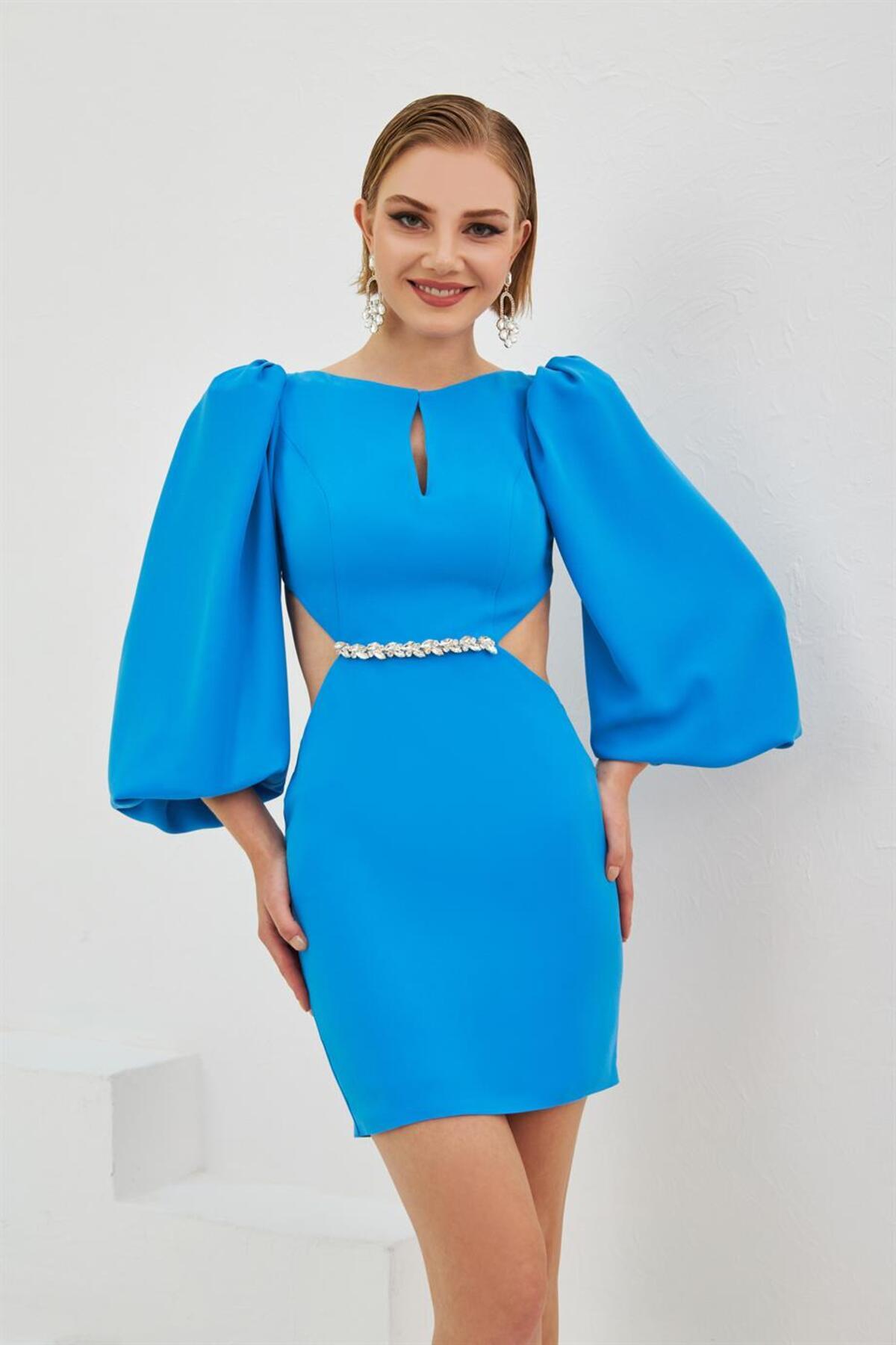 Mavi Krep Taşlı Balon Kollu Kısa Abiye Elbise Mavi Krep Taşlı Balon Kollu Kısa Abiye Elbise 58157 42