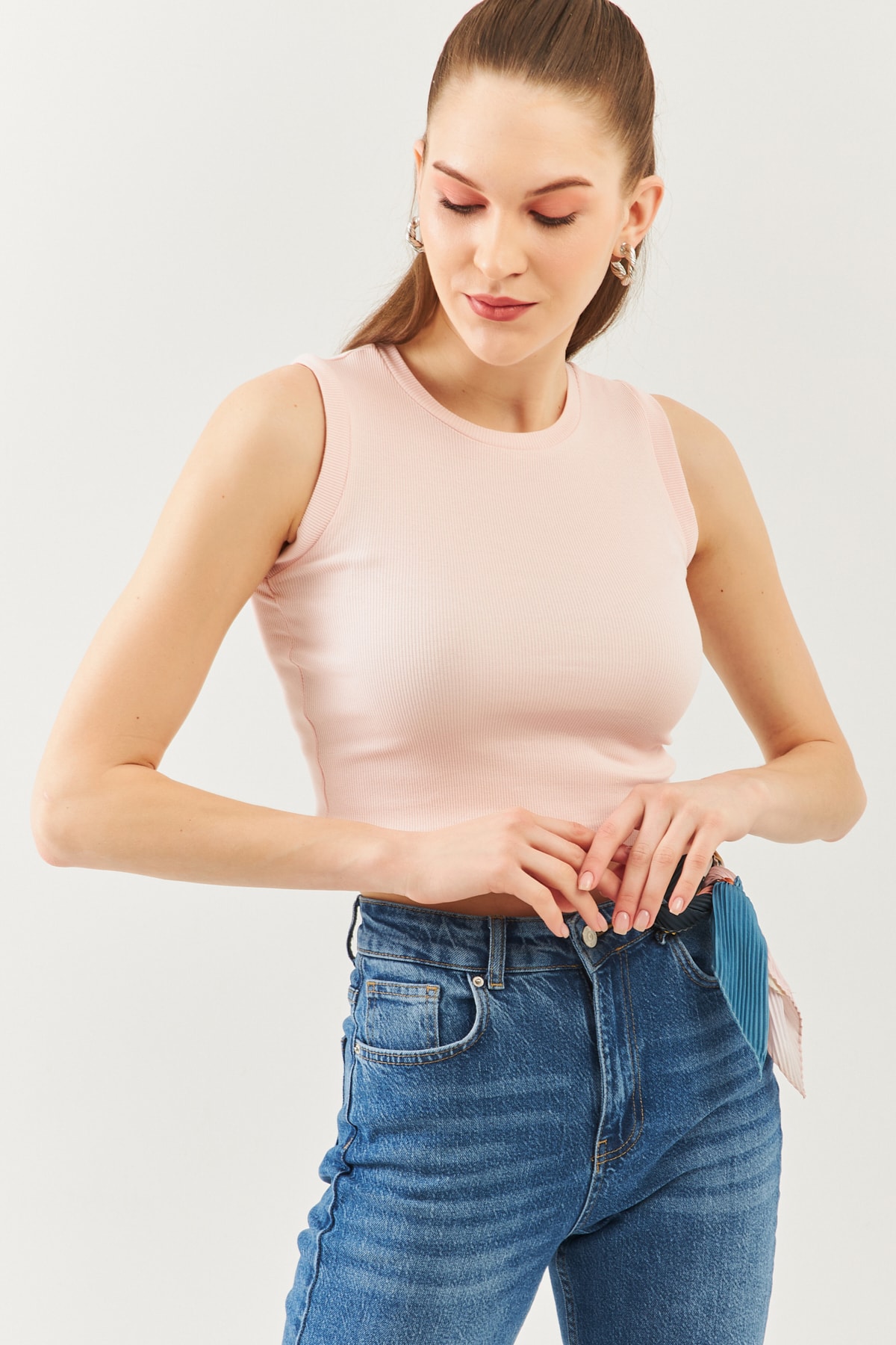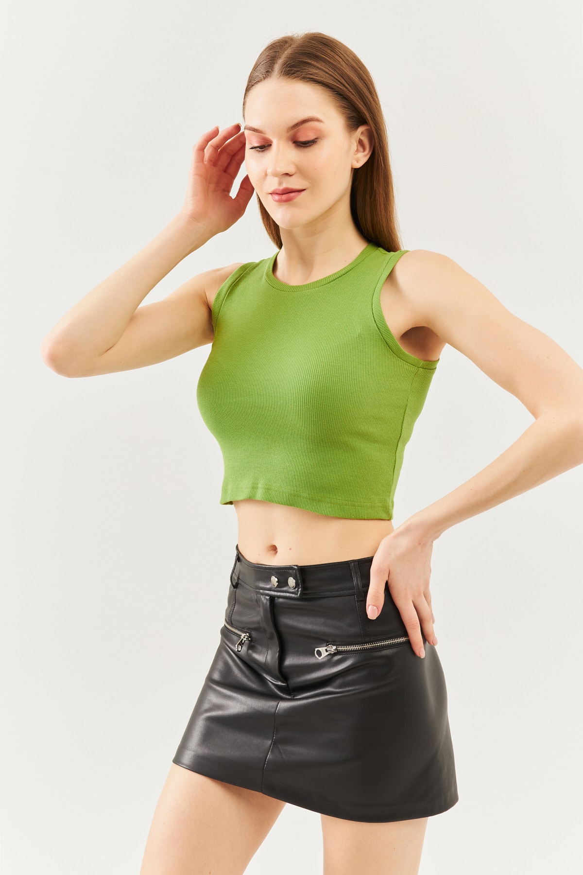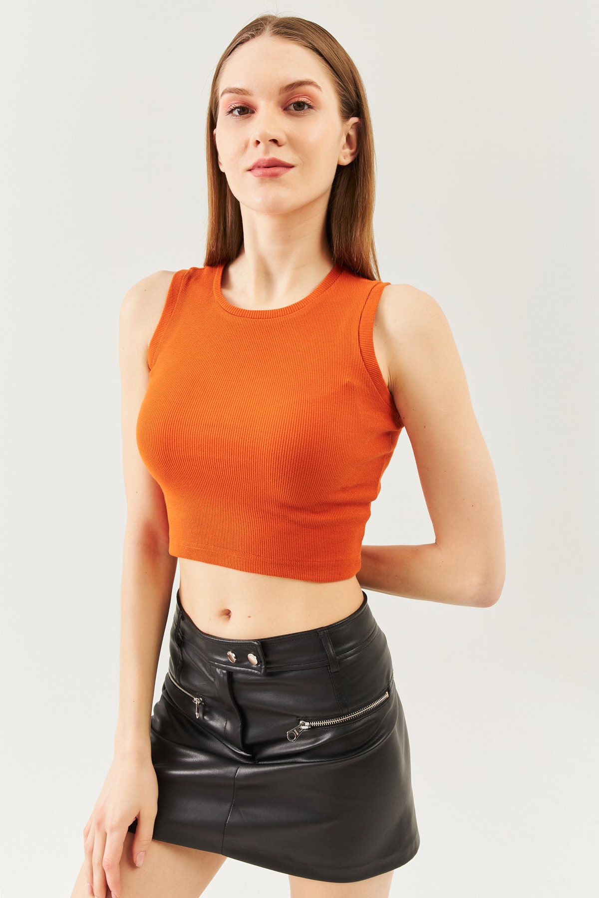 Açık Kahve Sıfır Kol Bisiklet Yaka Vucuda Oturan %100 Pamuklu Kaşkorse Esnek Crop Bluz Açık Kahve Sıfır Kol Bisiklet Yaka Vucuda Oturan %100 Pamuklu Kaşkorse Esnek Crop Bluz BGCRPSK01 M
