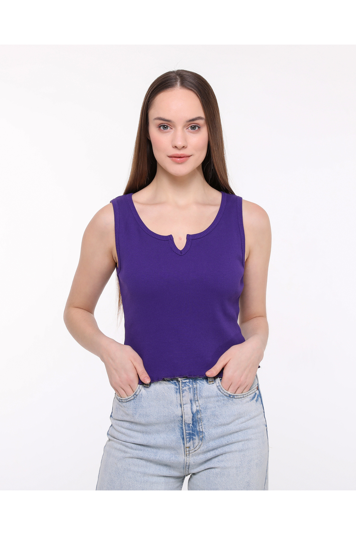 Mor Sıfır Kol Bisiklet Yaka Vücuda Oturan %100 Pamuklu Kaşkorse Esnek Crop Bluz Mor Sıfır Kol Bisiklet Yaka Vücuda Oturan %100 Pamuklu Kaşkorse Esnek Crop Bluz BGCRPSK01 M
