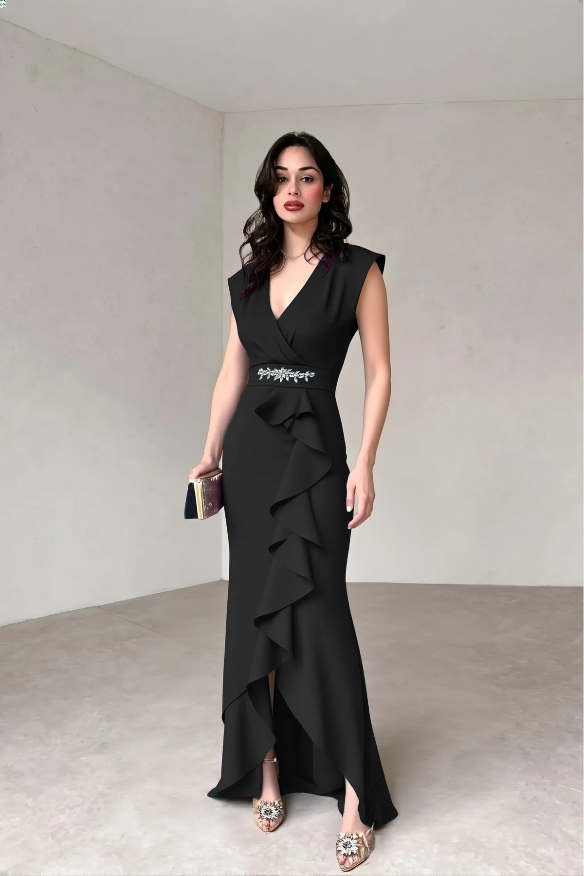 Siyah Krep Sırt Dekolteli Vatkalı Midi Abiye Elbise Siyah Krep Sırt Dekolteli Vatkalı Midi Abiye Elbise 58215 42