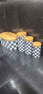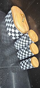 Bambu Kapak Görünümlü Dama Desenli Metal Ekmeklik Ve 3'lü Kavanoz Seti Siyahbeyaz Bambu Kapak Görünümlü Dama Desenli Metal Ekmeklik Ve 3'lü Kavanoz Seti Siyahbeyaz KMS-3156*3 تک سایز