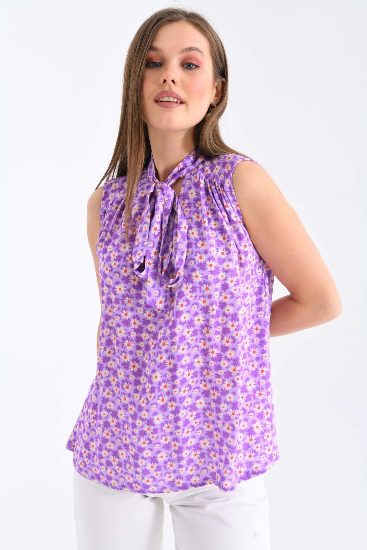 Papatyalı Önden Bağlama Detaylı Kolsuz Lila Bluz Papatyalı Önden Bağlama Detaylı Kolsuz Lila Bluz 23113-Lila 40