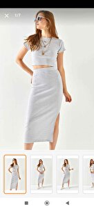 Kadın Çizgili Gri Kısa Kollu Yırtmaçlı Etekli Likralı Takım TKM-19000194 Kadın Çizgili Gri Kısa Kollu Yırtmaçlı Etekli Likralı Takım TKM-19000194 L