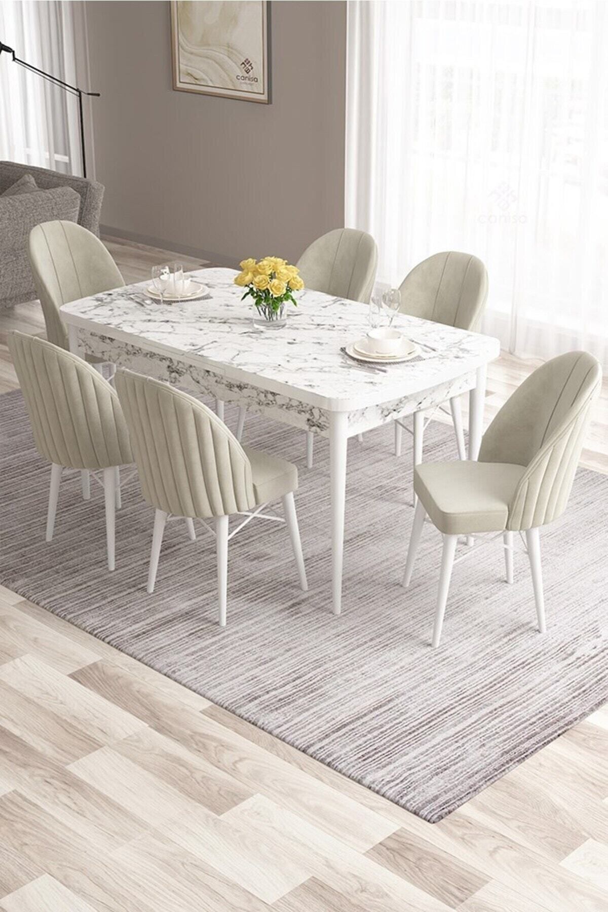 Ves Serisi 80x132 Mdf Açılabilir Beyaz Mermer Desen Mutfak Masa Takımı 6 Adet Cappucino Sandalye Ves Serisi 80x132 Mdf Açılabilir Beyaz Mermer Desen Mutfak Masa Takımı 6 Adet Cappucino Sandalye 22VES06BYZMR06 تک سایز