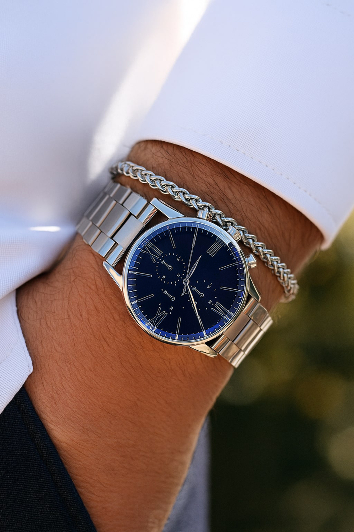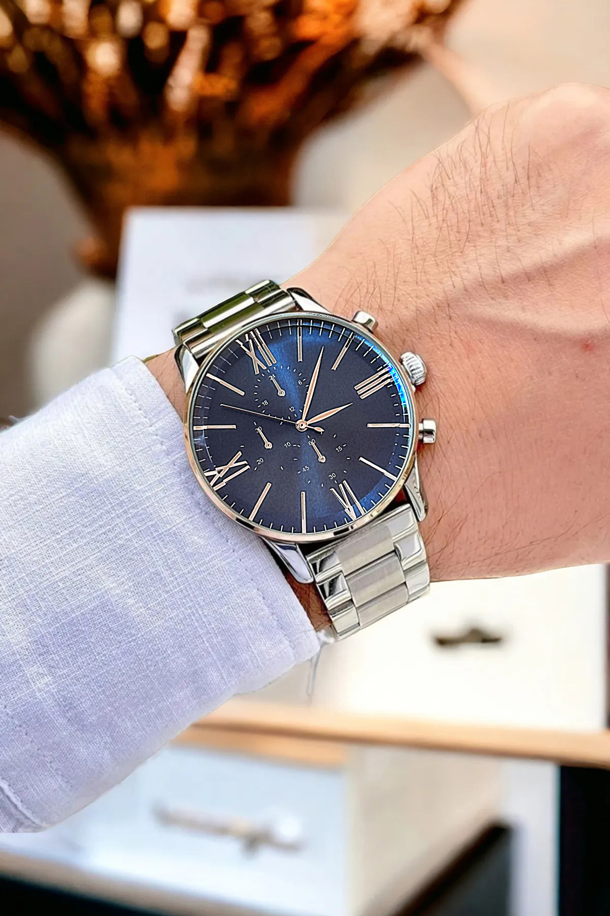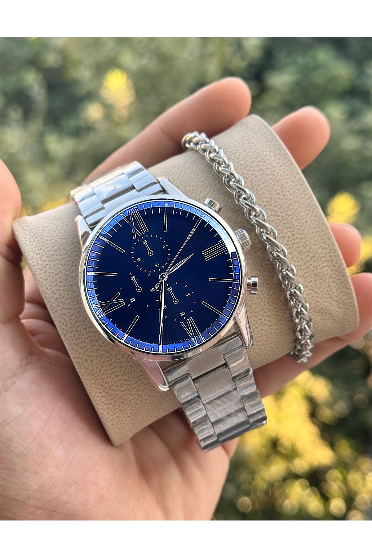 Bileklik Hediyeli Çelik Kordon Gümüş Renk Lacivert Kadran Erkek Kol Saati Bileklik Hediyeli Çelik Kordon Gümüş Renk Lacivert Kadran Erkek Kol Saati T-895x-HM تک سایز