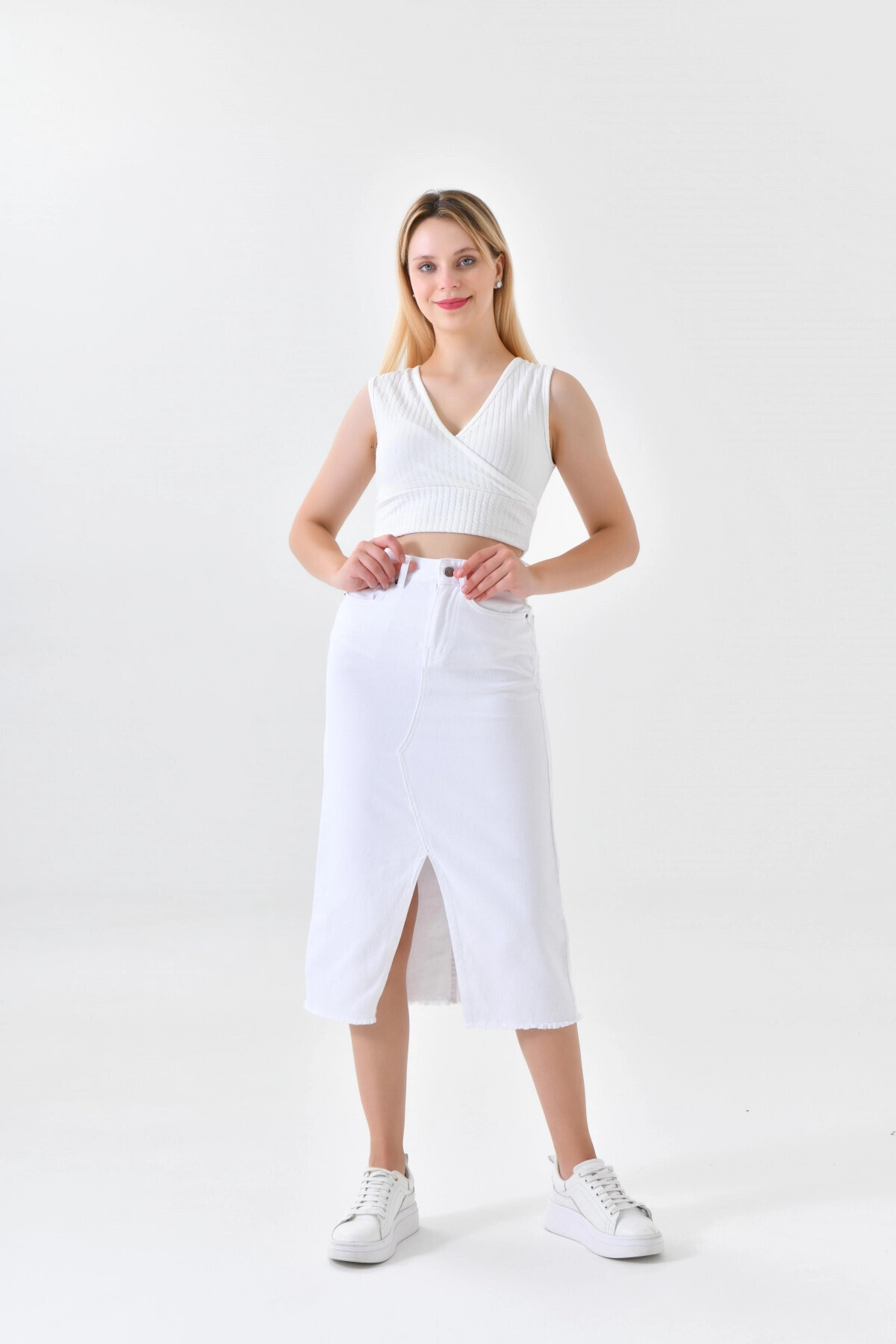 Beyaz Yırtmaçlı Kot Etek Beyaz Yırtmaçlı Kot Etek KRN033-BEYAZ M