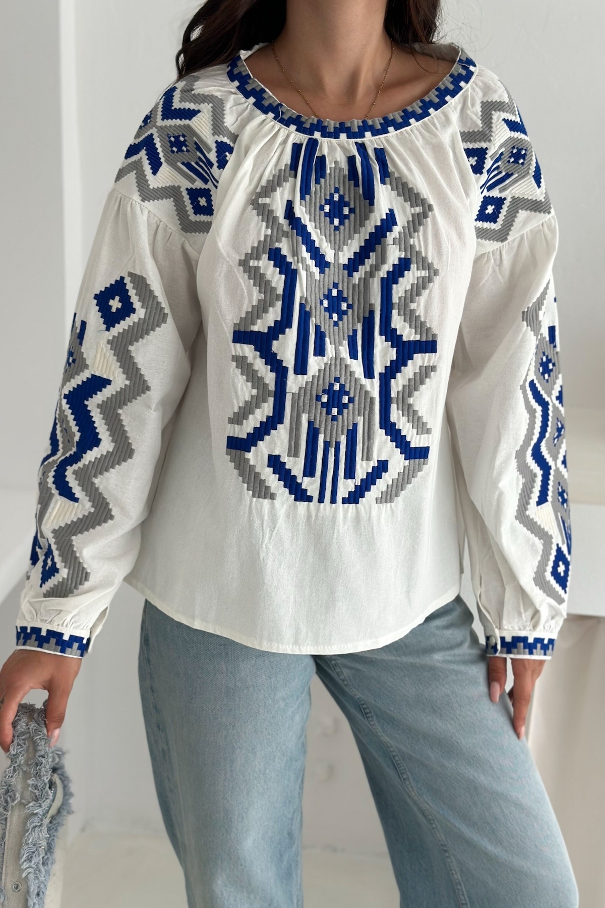 Kadın Beyaz Yakası Bağlamalı Nakış İşlemeli Tasarım Bluz Kadın Beyaz Yakası Bağlamalı Nakış İşlemeli Tasarım Bluz 5254 L