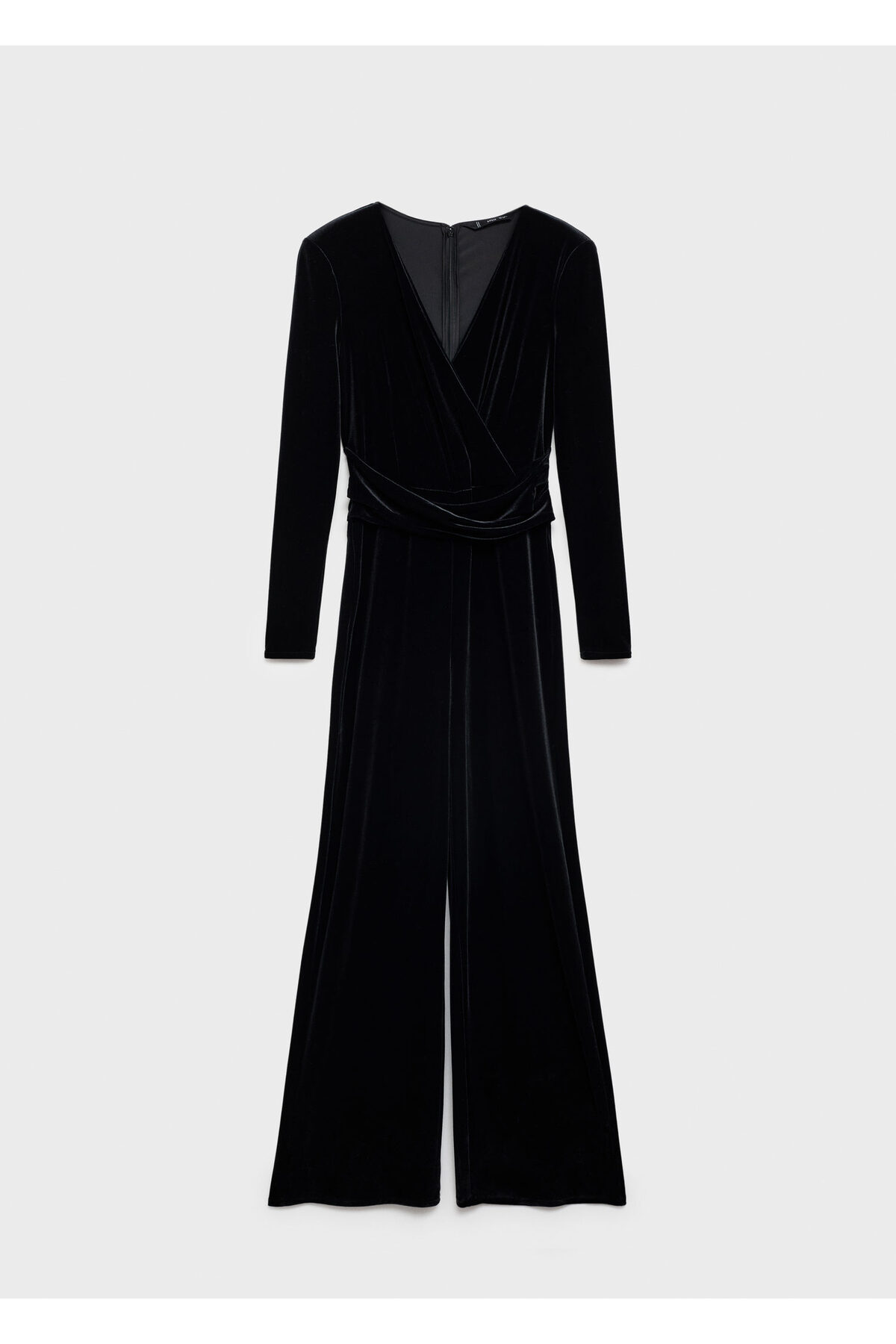 V Yaka Beli Bağlamalı Desenli Saten Tulum V Yaka Beli Bağlamalı Desenli Saten Tulum ST3010 L