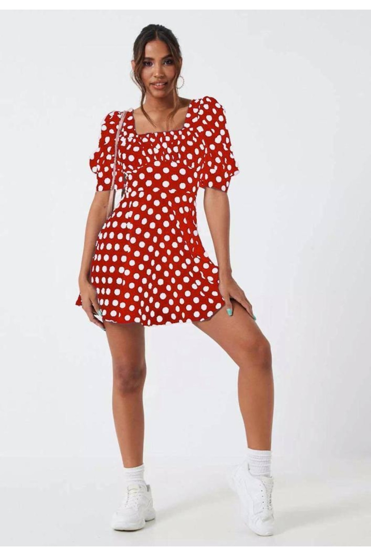 Kadın kırmızı beyaz puantiye Desenli ön tokalı dik büzgülü yakalı elbise Kadın kırmızı beyaz puantiye Desenli ön tokalı dik büzgülü yakalı elbise TY8200ZR-008 XL