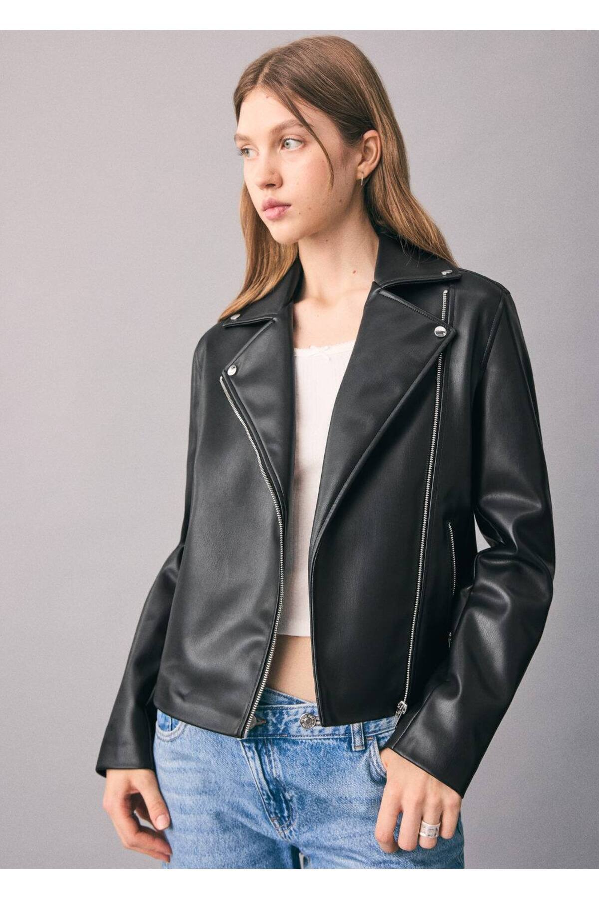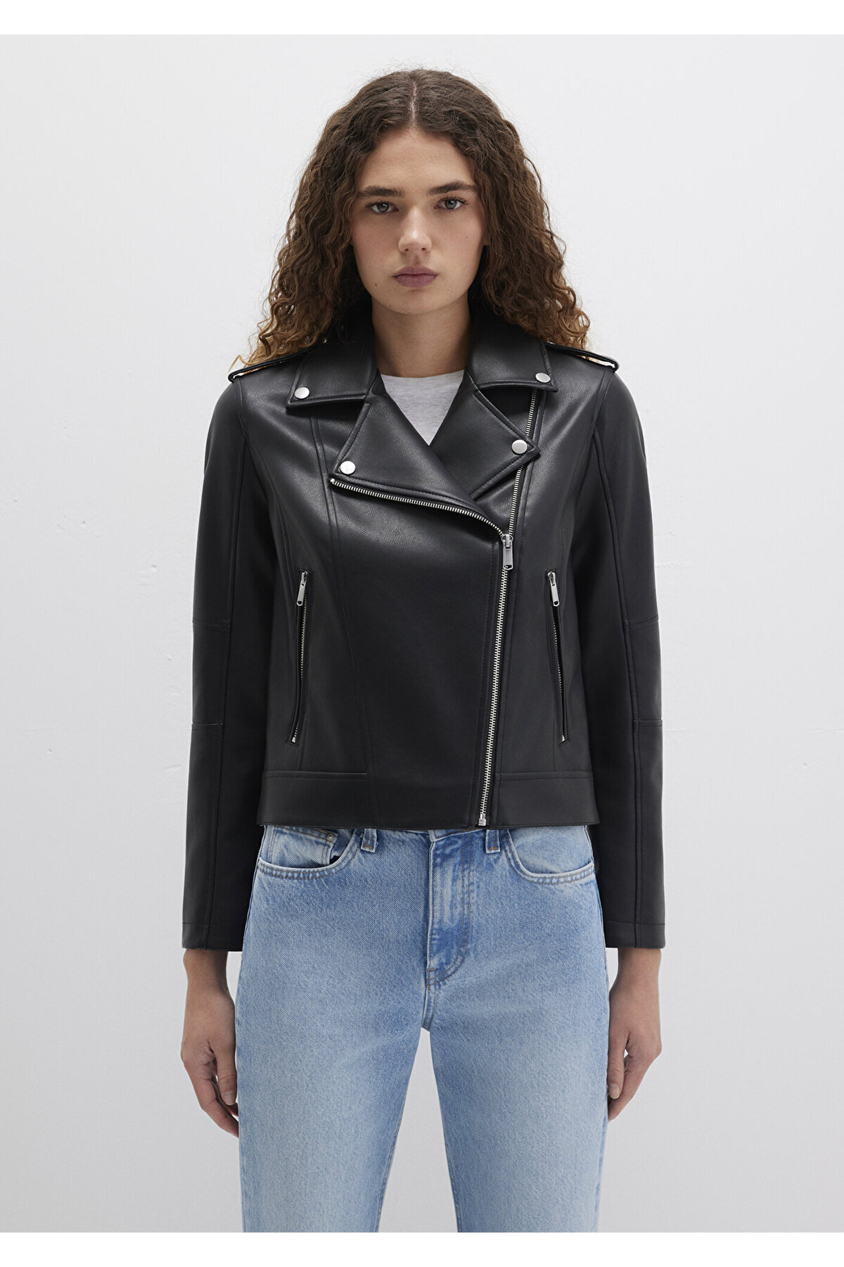 Biker Yaka Siya Suni Deri Ceket Slim Fit / Dar Kesim 1110221-900 Biker Yaka Siya Suni Deri Ceket Slim Fit / Dar Kesim 1110221-900 XL