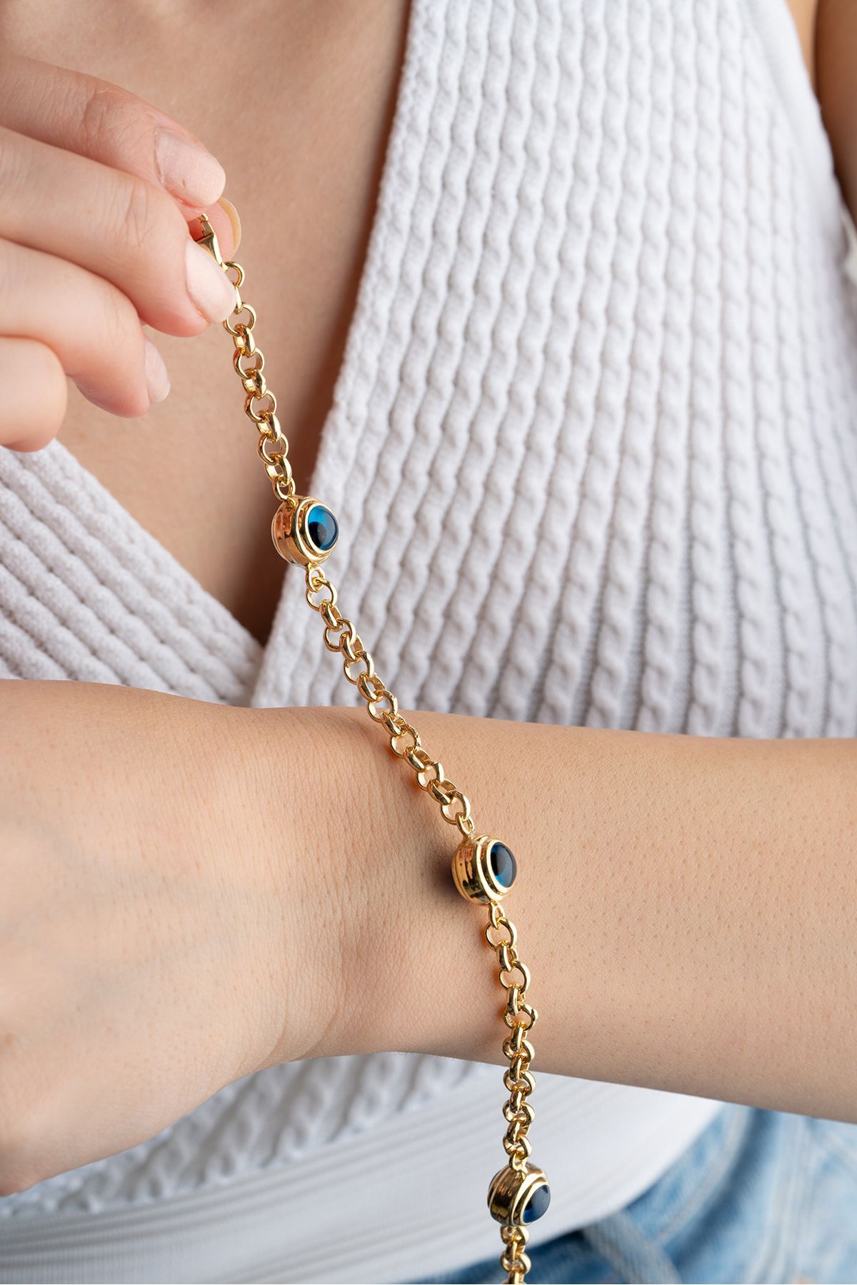 925 Ayar Gümüş Gold 3'Lü Nazar Göz Hallow Zincirli Bileklik 925 Ayar Gümüş Gold 3'Lü Nazar Göz Hallow Zincirli Bileklik NRZ999108 تک سایز