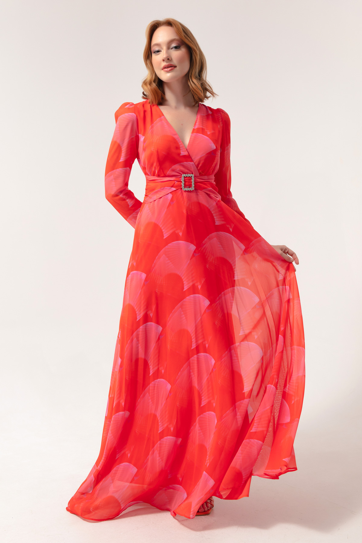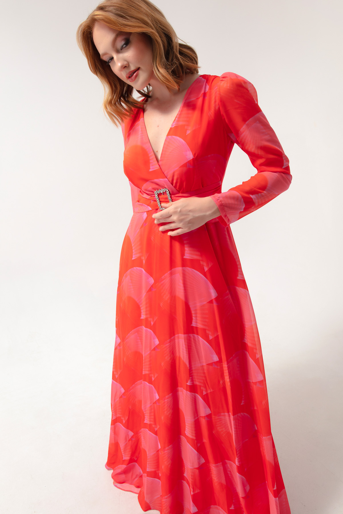 Kadın Turuncu V Yaka Taşlı Kemerli Uzun Elbise Kadın Turuncu V Yaka Taşlı Kemerli Uzun Elbise 23Y012044 42