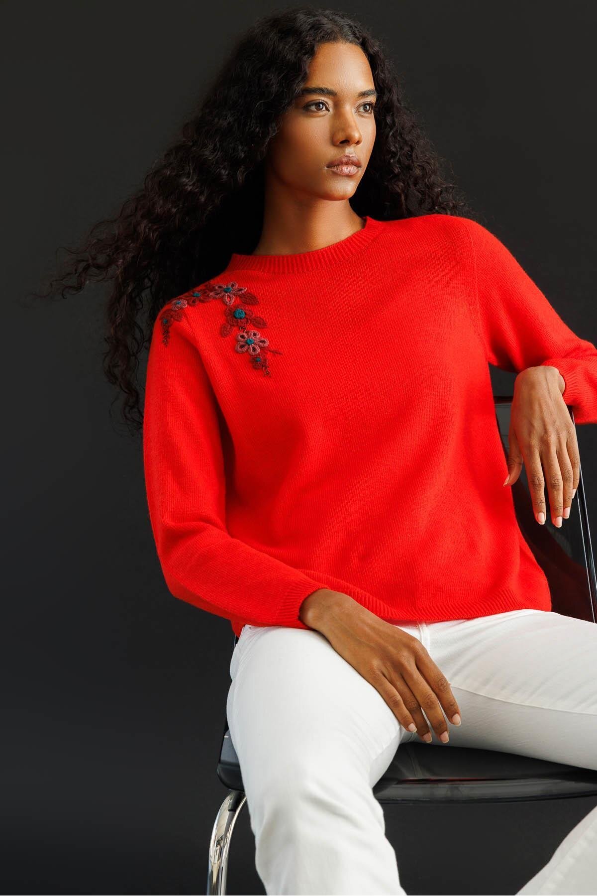 Kadın Sıfır Yaka Önü İşlemeli Uzun Yün Kazak Mercan Kadın Sıfır Yaka Önü İşlemeli Uzun Yün Kazak Mercan 23156 XL