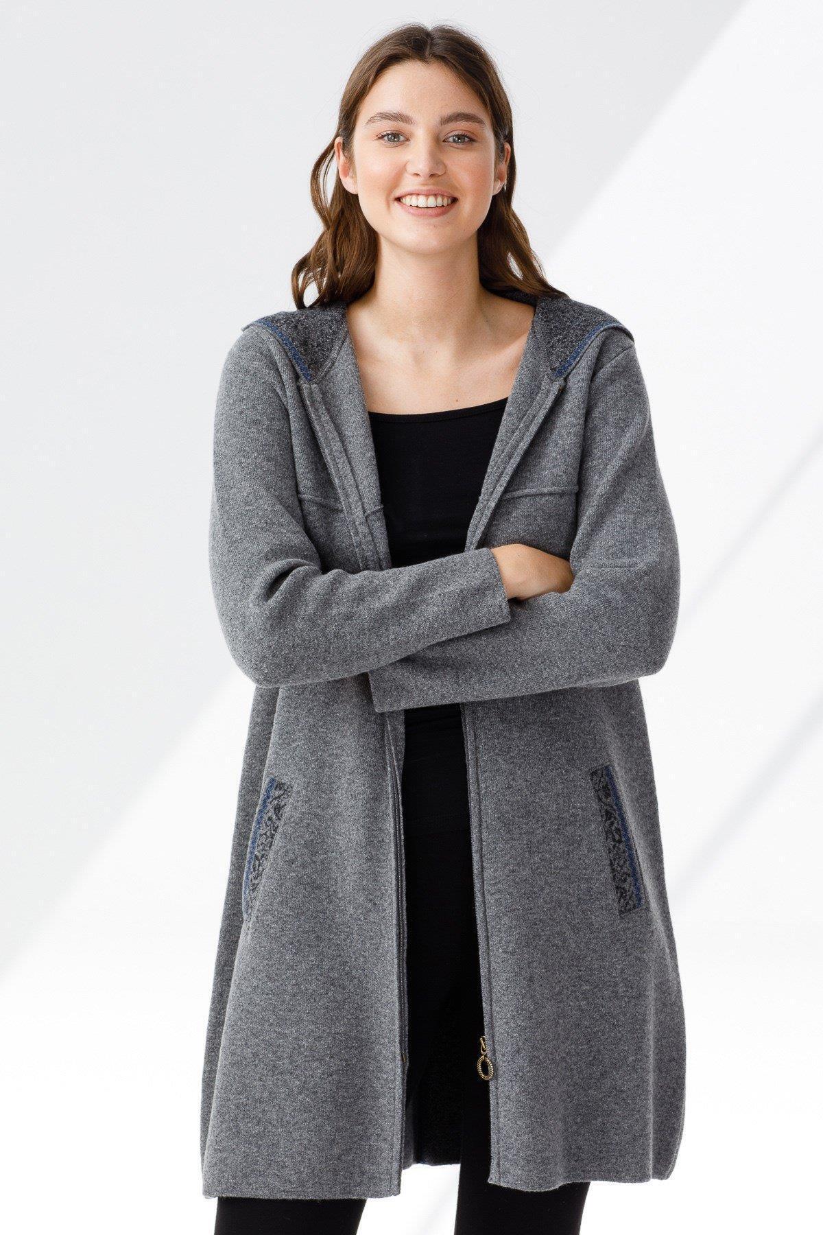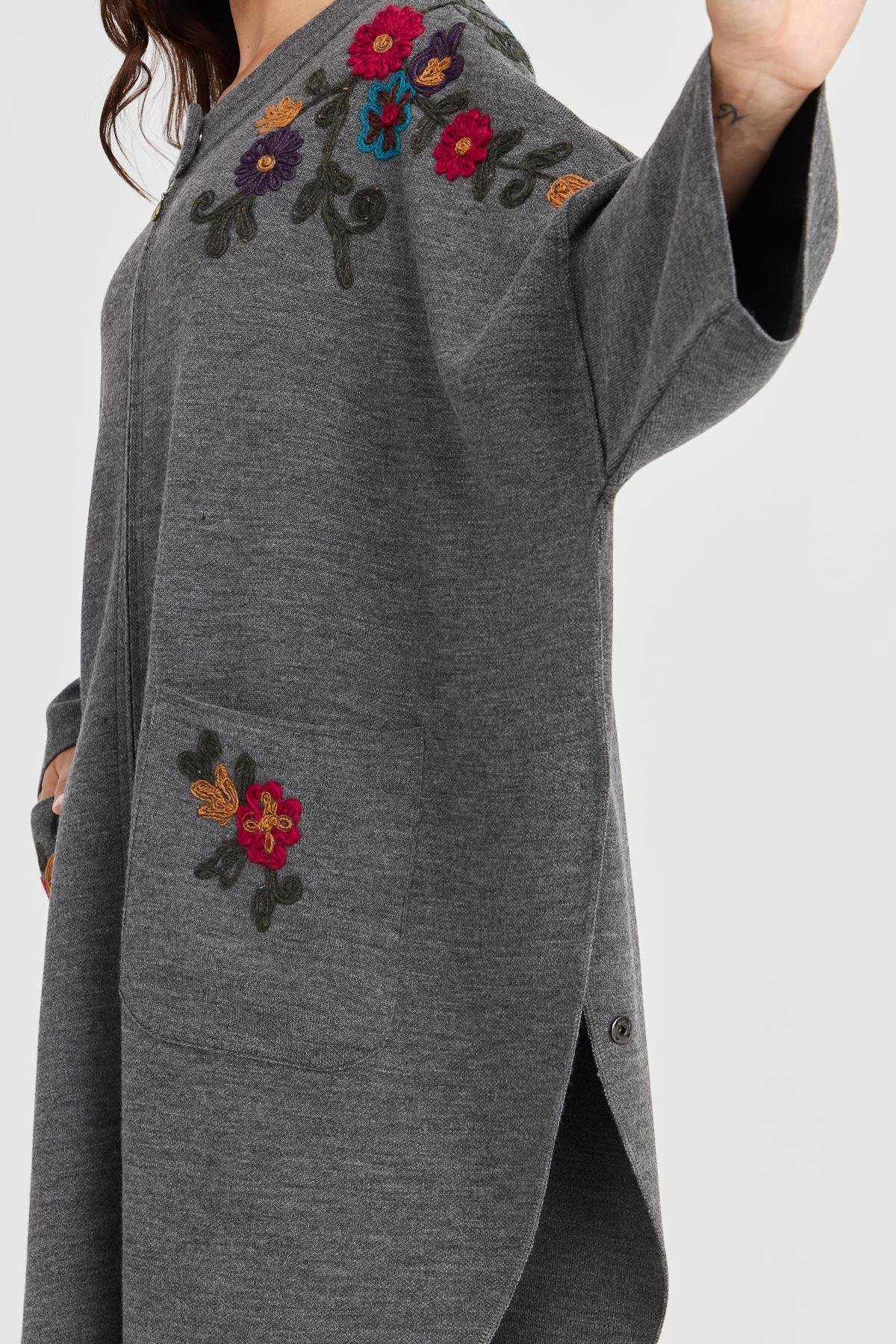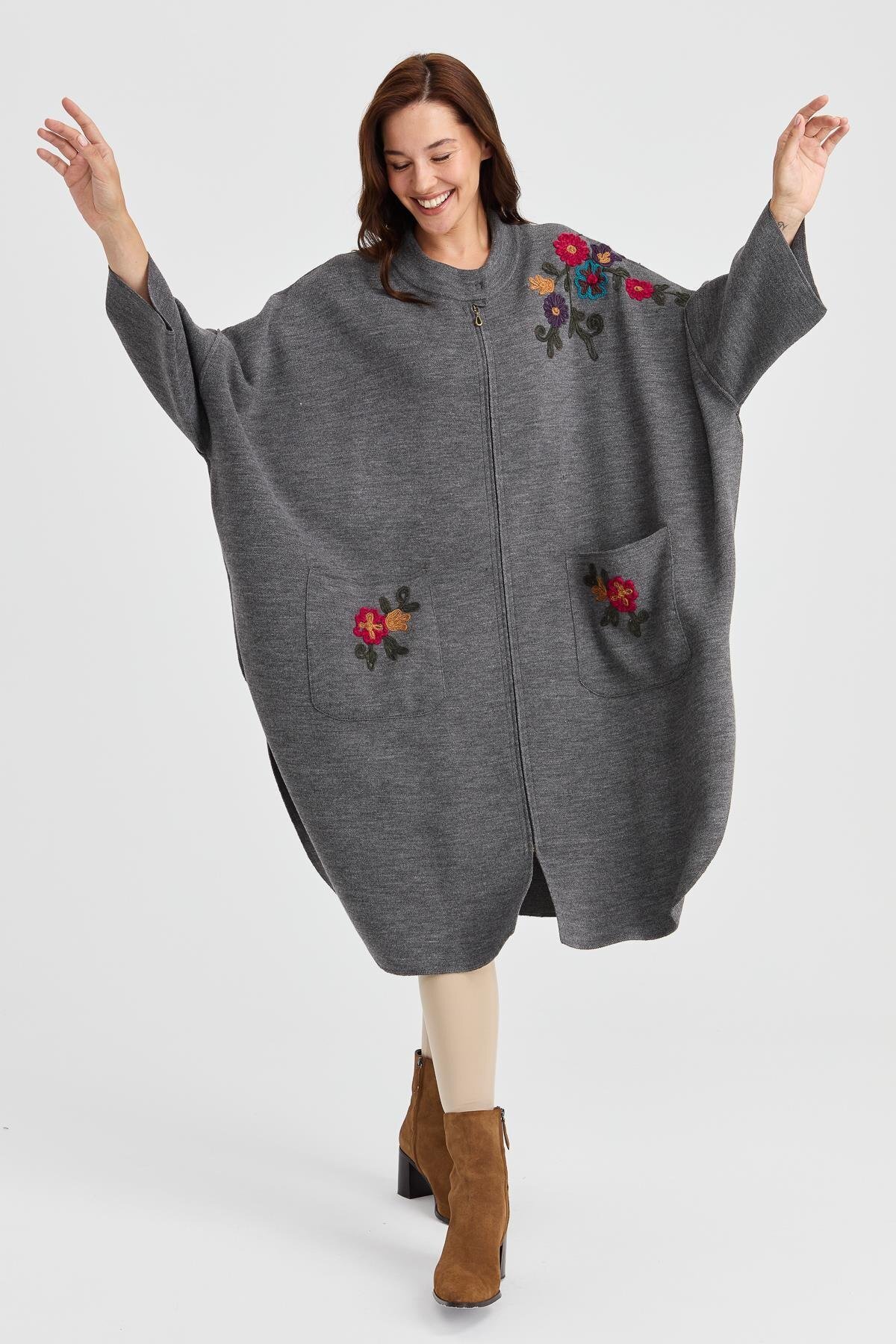 Kadın Dik Yaka Omzu ve Cebi İşlemeli Fermuarlı Panço Gri.Melanj.Füme Kadın Dik Yaka Omzu ve Cebi İşlemeli Fermuarlı Panço Gri.Melanj.Füme 23063 Standart