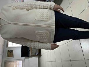 Kadın Dik Yaka Cebi ve Kolu Saç Örgü Yün Hırka Kemik Kadın Dik Yaka Cebi ve Kolu Saç Örgü Yün Hırka Kemik 23203 XL