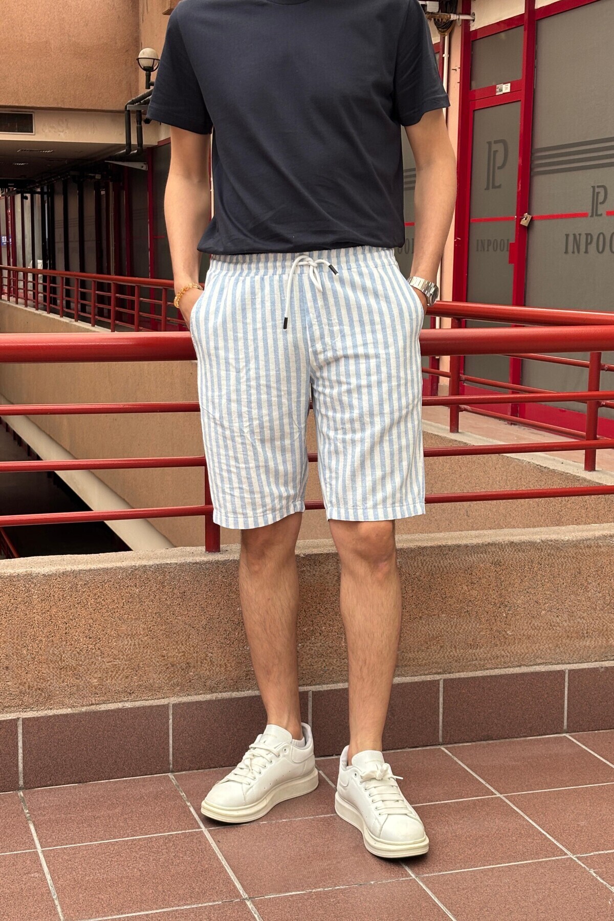 Erkek bel bağcıklı, şeritli, pamuklu kumaş, keten dokuma, şort Erkek bel bağcıklı, şeritli, pamuklu kumaş, keten dokuma, şort INP167 31