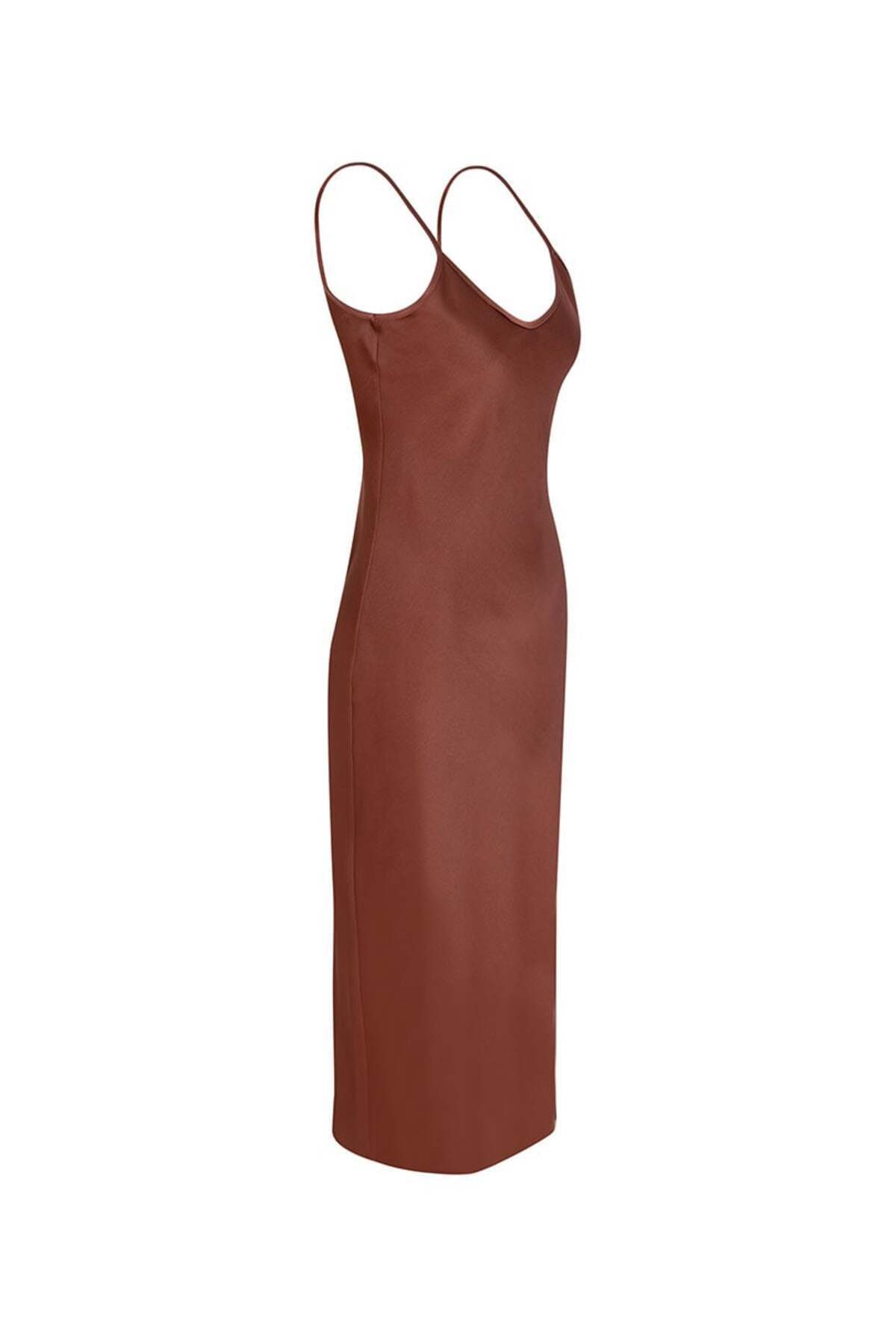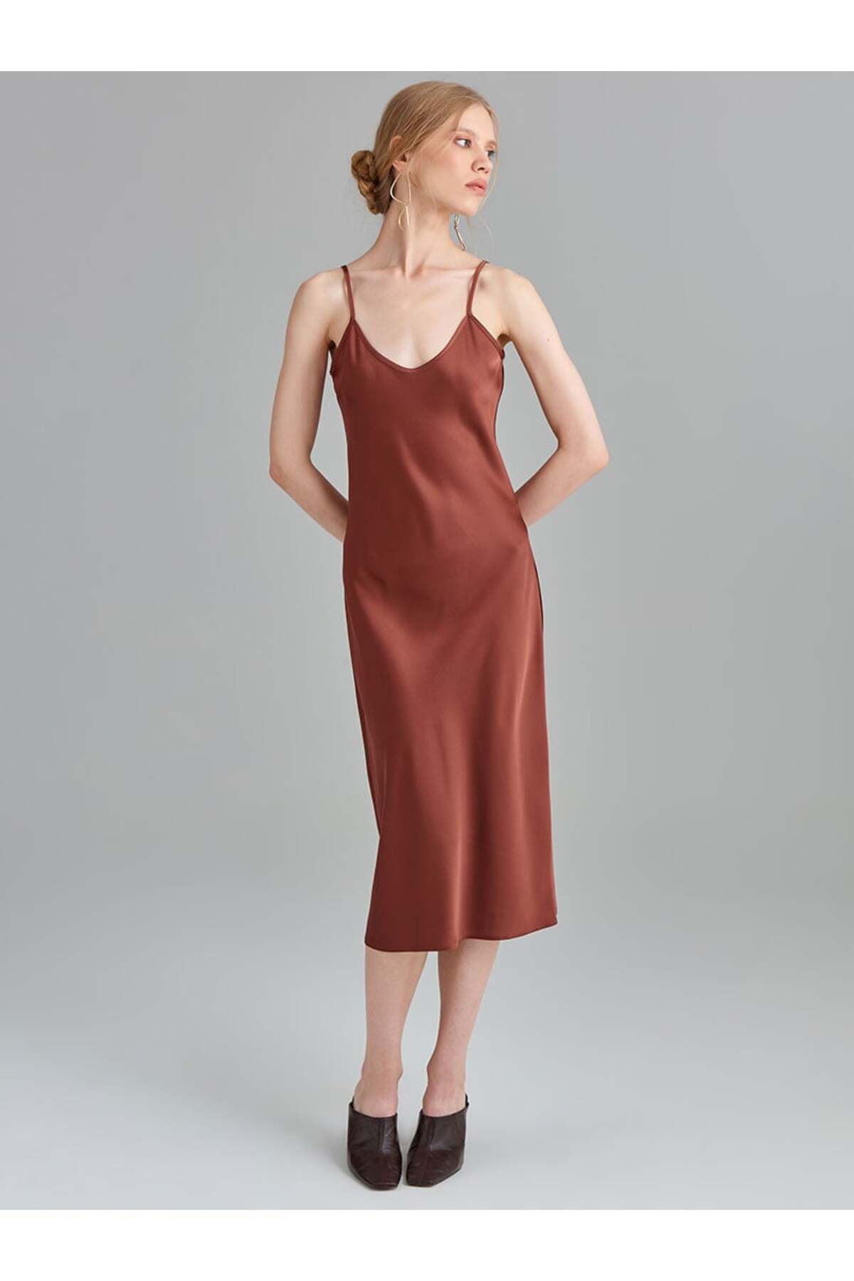 Spagetti Askılı Saten Midi Elbise - Bakır Spagetti Askılı Saten Midi Elbise - Bakır 7693 XL