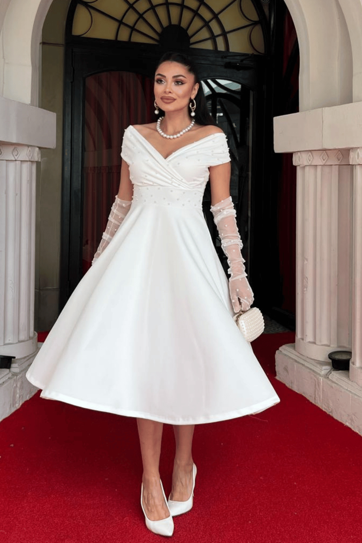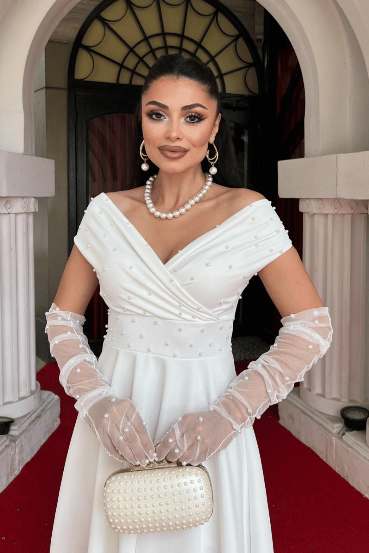 Krep Kumaş Kayık Yaka İnci Detaylı Abiye Elbise - BEYAZ Krep Kumaş Kayık Yaka İnci Detaylı Abiye Elbise - BEYAZ GYM-0946 50