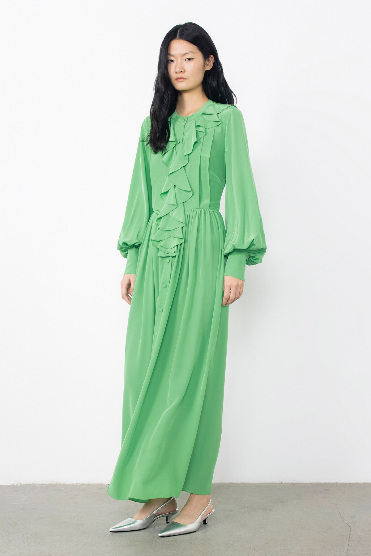 Yakası Boncuklu Kordon Detaylı Eteği Büzülebilir Tafta Kol Elbise Yakası Boncuklu Kordon Detaylı Eteği Büzülebilir Tafta Kol Elbise M3KM5I0271 46