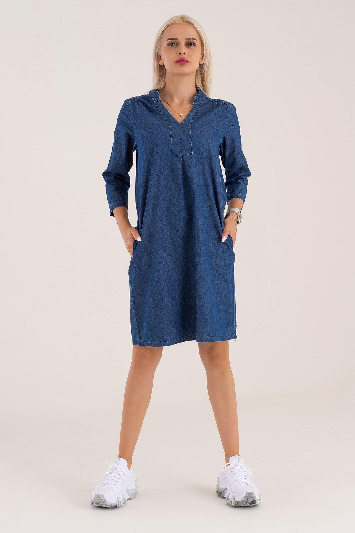 Kadın Mavi Cepli 3/4 Kol Yıkanmış Pamuklu Efsane Kot Elbise Kadın Mavi Cepli 3/4 Kol Yıkanmış Pamuklu Efsane Kot Elbise 0165 3XL
