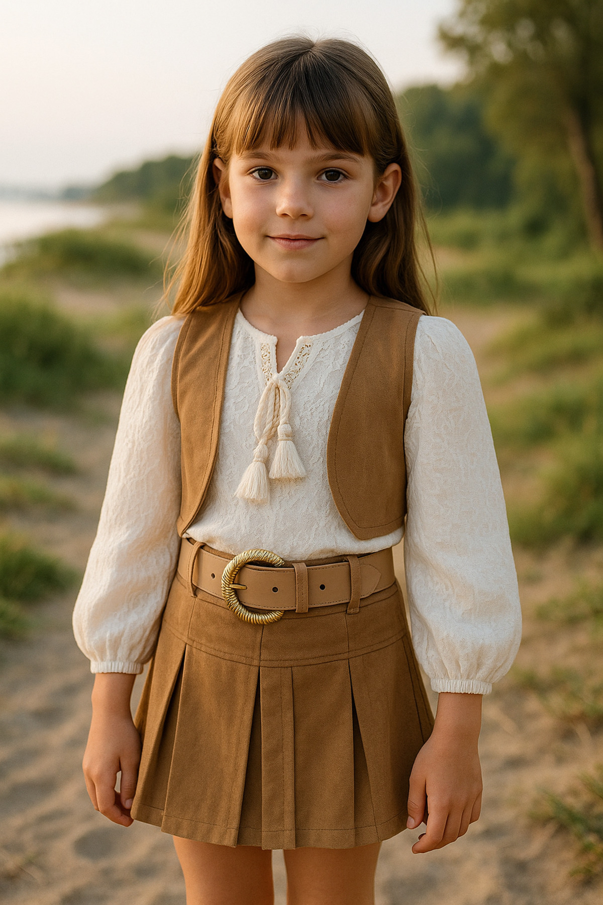Kız Çocuk Gabardin Yelek İpli Gömlek Pileli Etek ve Gold Tokalı Kemer 4'lü Takım Kız Çocuk Gabardin Yelek İpli Gömlek Pileli Etek ve Gold Tokalı Kemer 4'lü Takım K0033 12 Yaş