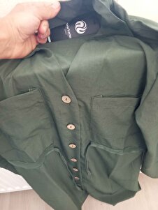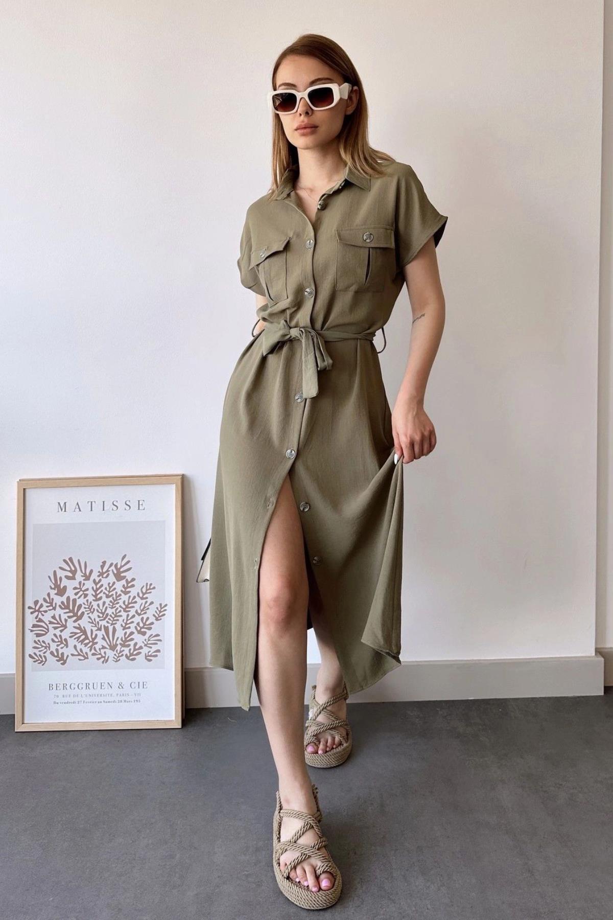 Haki Uzun Kol, Derin Gömlek Yaka Beli Bağlamalı Cepli Önü Düğmeli, A Kesim Salaş Elbise Haki Uzun Kol, Derin Gömlek Yaka Beli Bağlamalı Cepli Önü Düğmeli, A Kesim Salaş Elbise NY3411 42