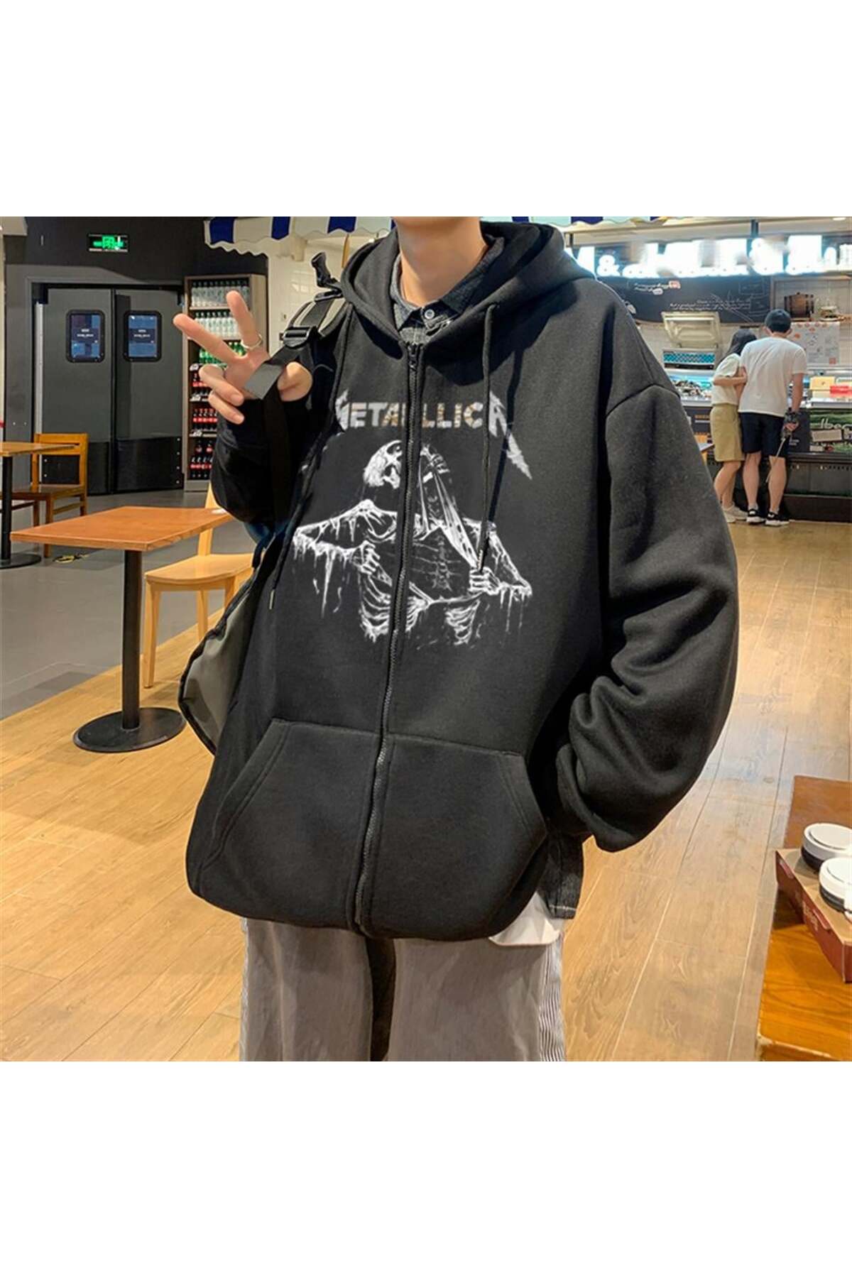 Metallica Skeleton Baskılı Oversize Fermuarlı Siyah Unisex Kapüşonlu Hırka Metallica Skeleton Baskılı Oversize Fermuarlı Siyah Unisex Kapüşonlu Hırka TZ5376 L/XL