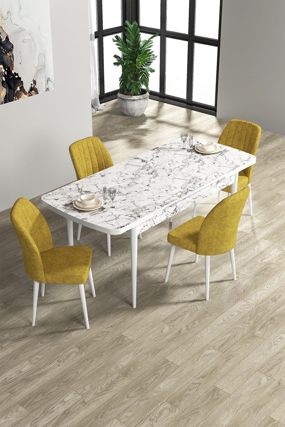 Rio Serisi 80x132 Açılabilir MDF Mutfak Masası Takımı Beyaz Mermer Desen Masa 4 Hardal Sandalye Rio Serisi 80x132 Açılabilir MDF Mutfak Masası Takımı Beyaz Mermer Desen Masa 4 Hardal Sandalye RİOBYZMR41 تک سایز