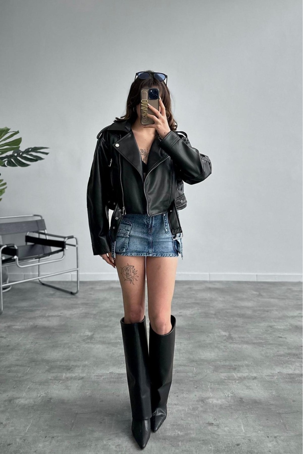 Yeni Sezon Oversize Kadın Siyah Biker Deri Ceket Yeni Sezon Oversize Kadın Siyah Biker Deri Ceket Oversizedericeket-1022 2XL