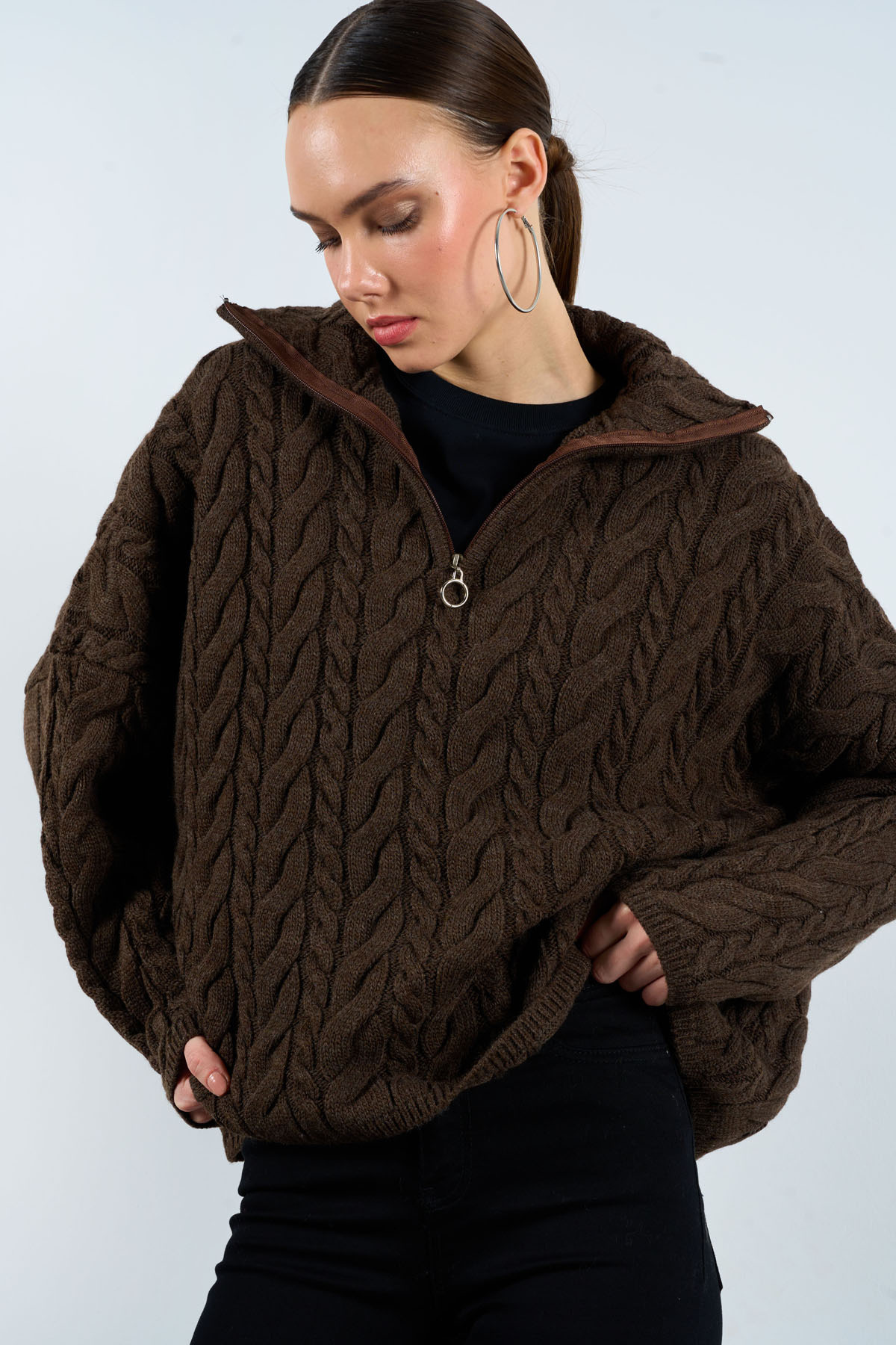 Kadın Krem Yakası Fermuarlı Örgü Desen Oversize Kazak Kadın Krem Yakası Fermuarlı Örgü Desen Oversize Kazak TK231078 Standart