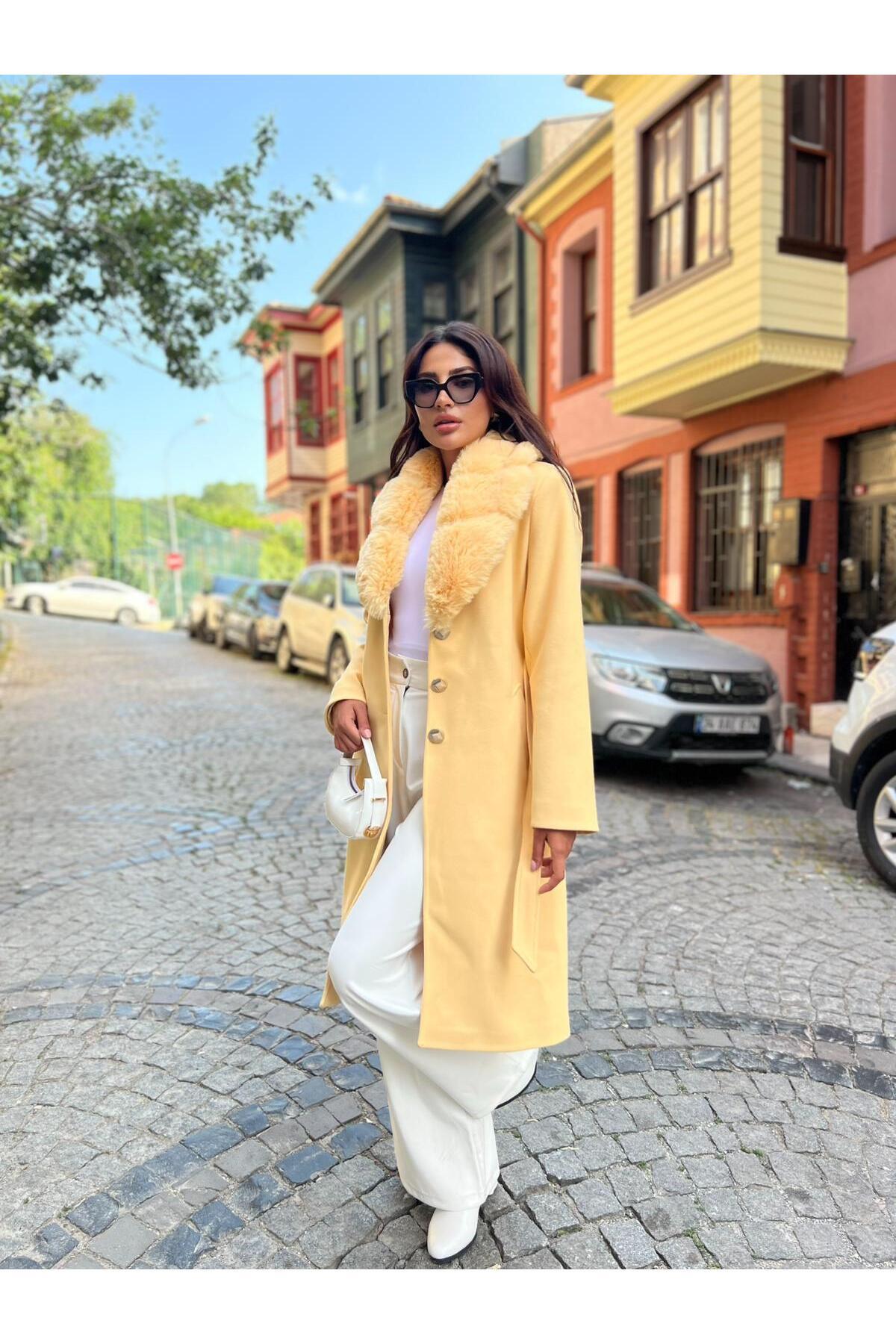 Kadın Hardal KAŞE Düğmeli Kuşaklı Erkek yaka Astarlı Kaban 70607 Kadın Hardal KAŞE Düğmeli Kuşaklı Erkek yaka Astarlı Kaban 70607 M/L