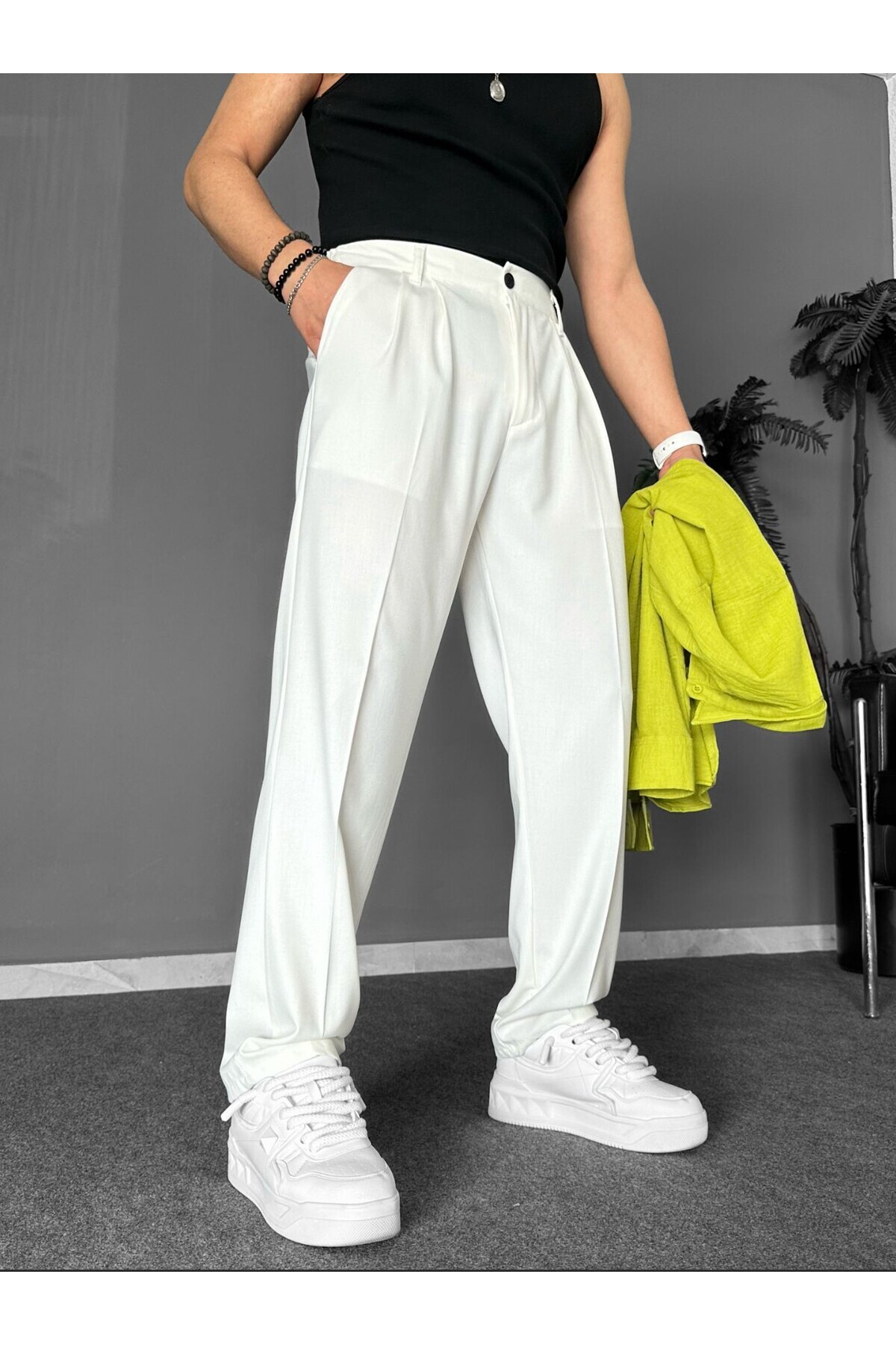 Bol Kalıp Beyaz Renk Jakar Kumaş Fitilli Pantolon Bol Kalıp Beyaz Renk Jakar Kumaş Fitilli Pantolon K90 2XL