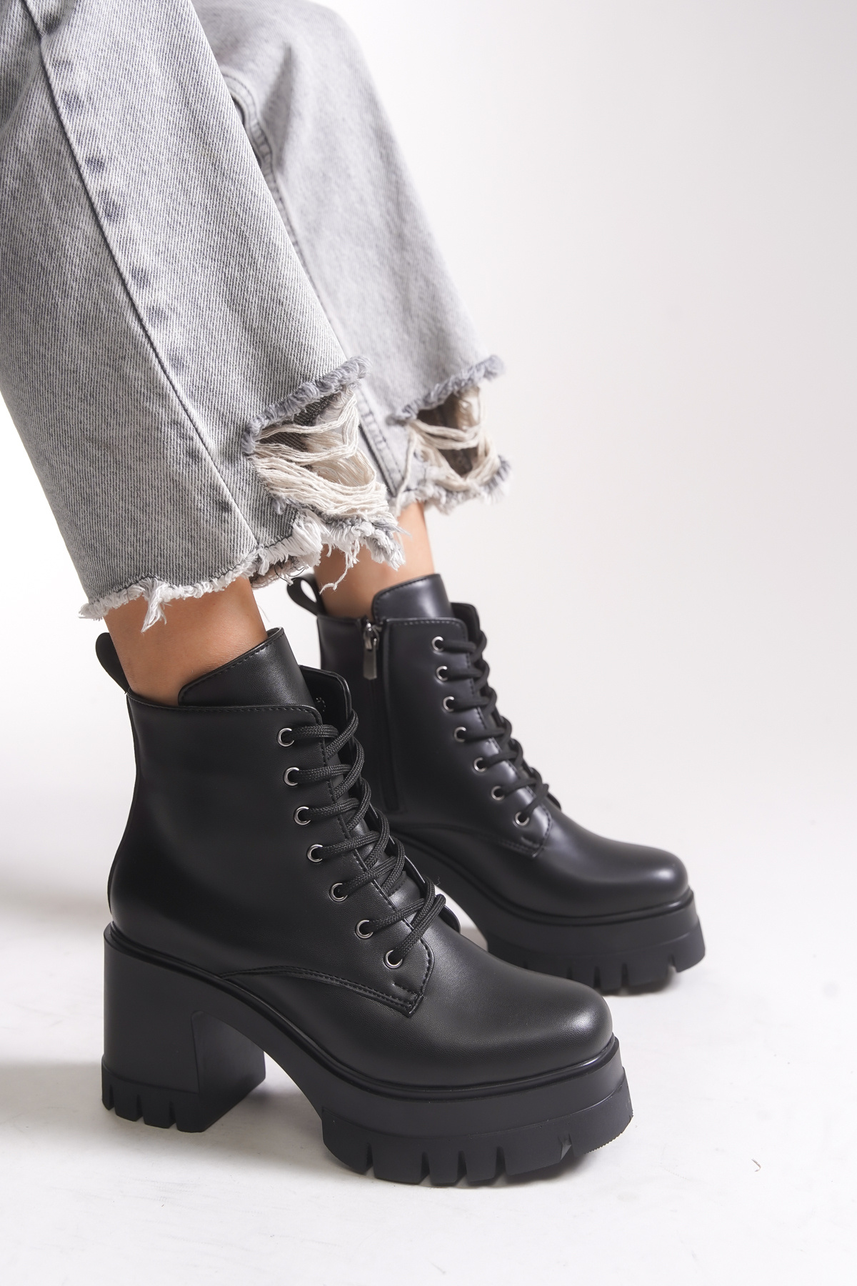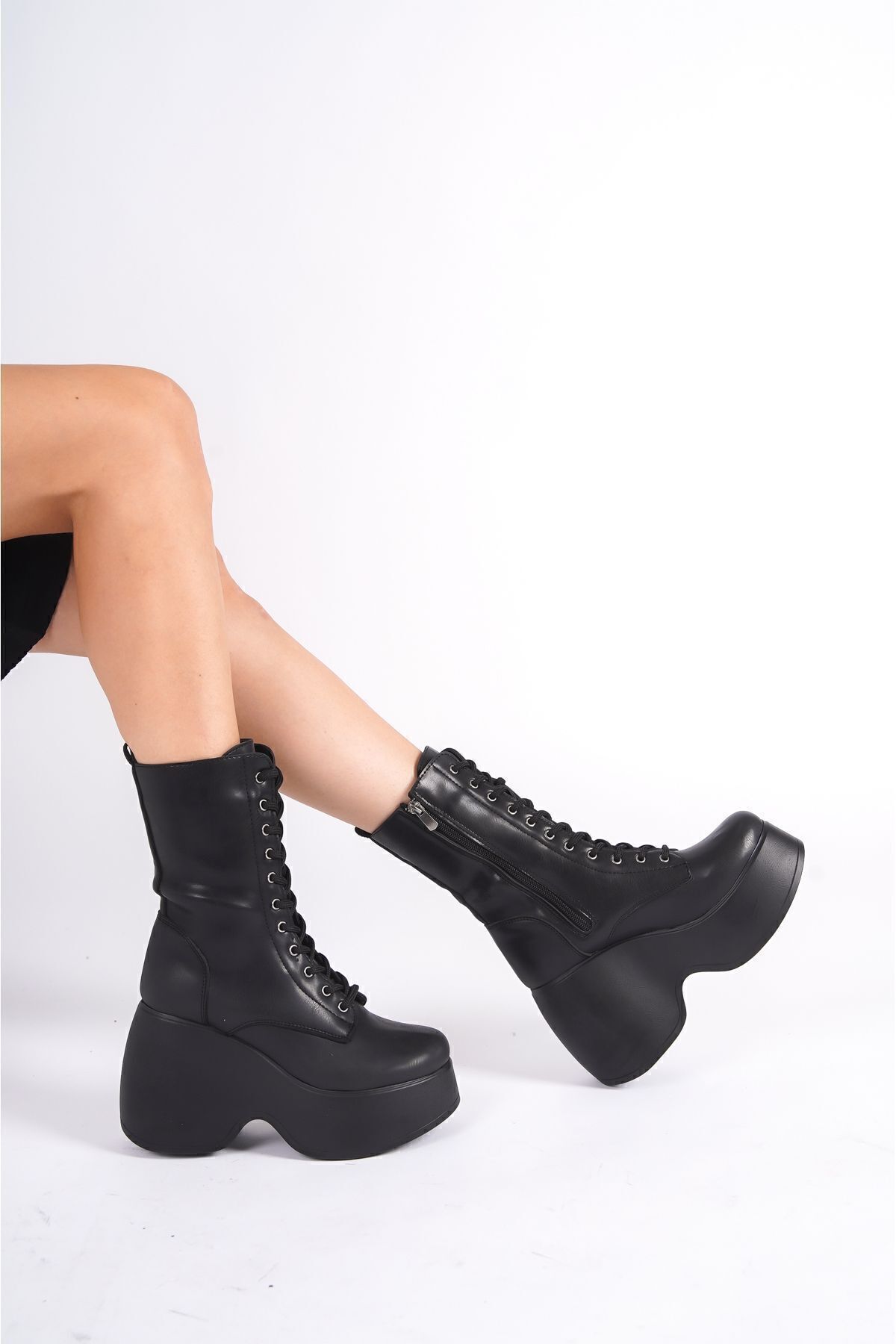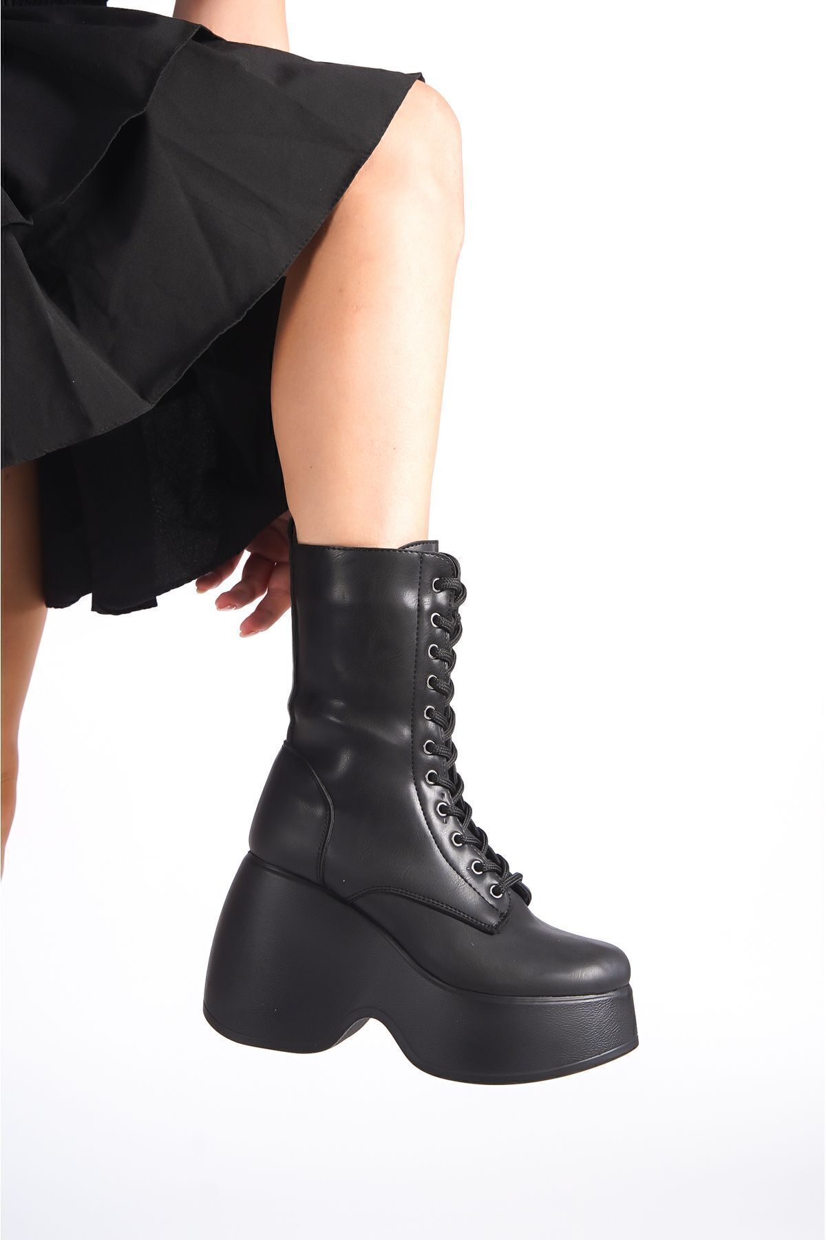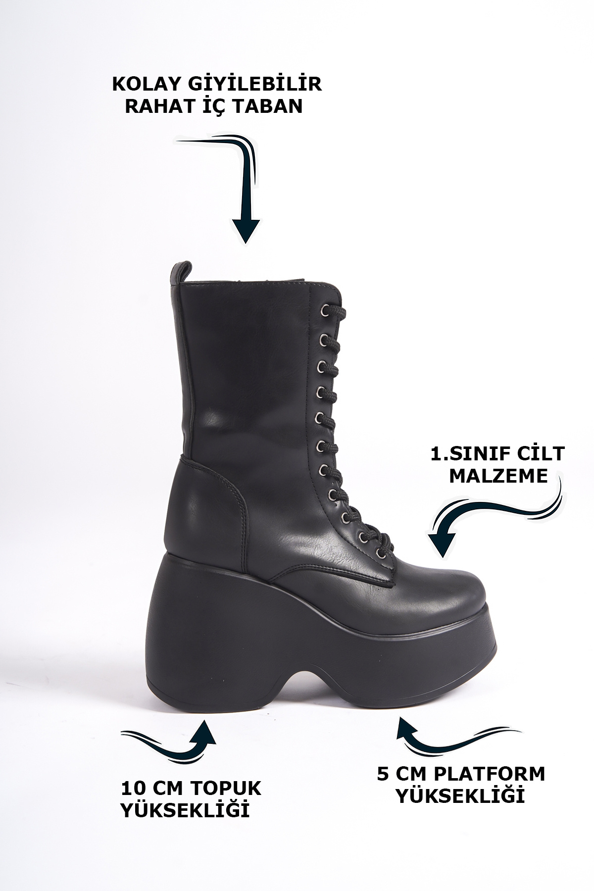 Siyah Cilt Yandan Fermuarlı Bağcıklı Yüksek Dolgu Topuklu Mevsimlik Kadın Uzun Bot Bootie Siyah Cilt Yandan Fermuarlı Bağcıklı Yüksek Dolgu Topuklu Mevsimlik Kadın Uzun Bot Bootie kcli-bot-20 40