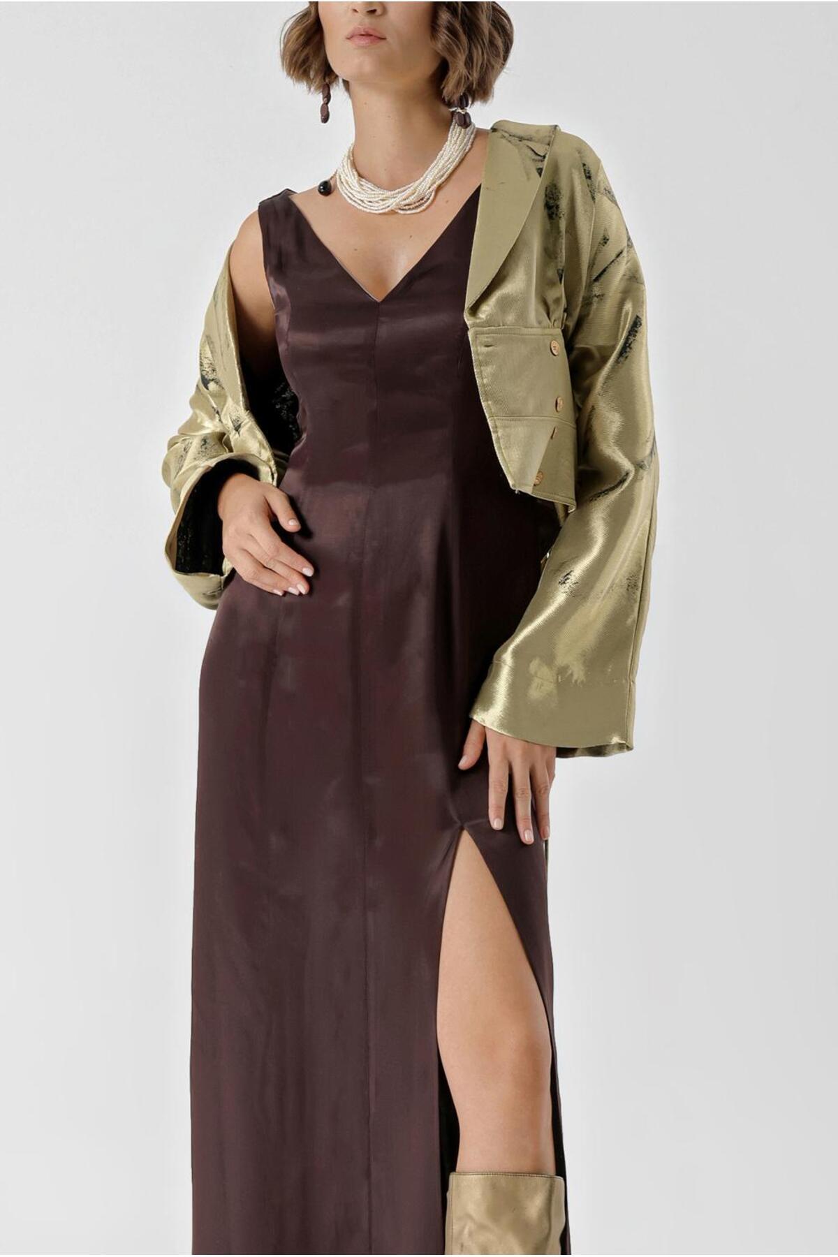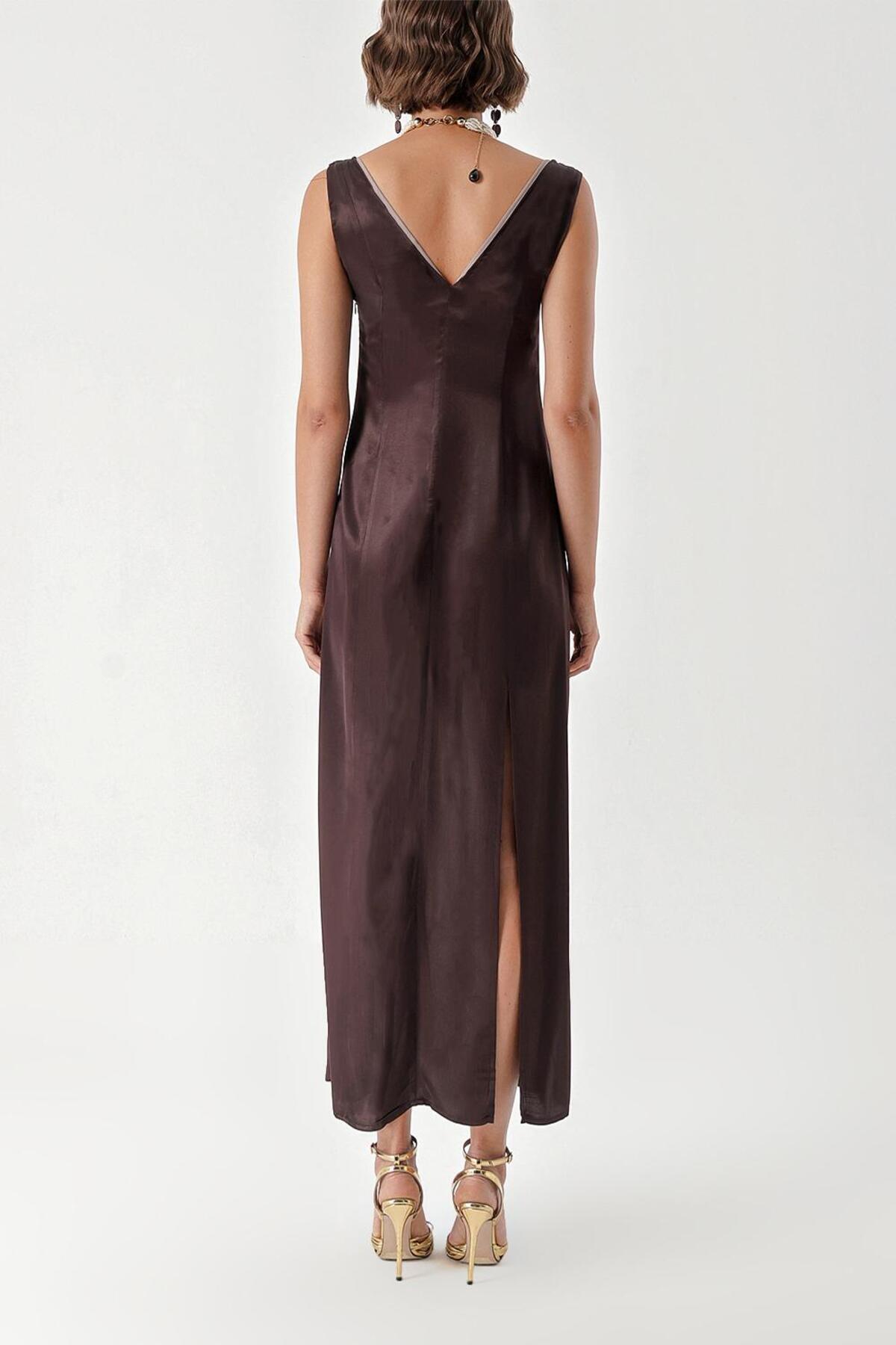 Kahve Kolsuz V yaka yırtmaçalı elbise 94217 Kahve Kolsuz V yaka yırtmaçalı elbise 94217 M18231094217121 L