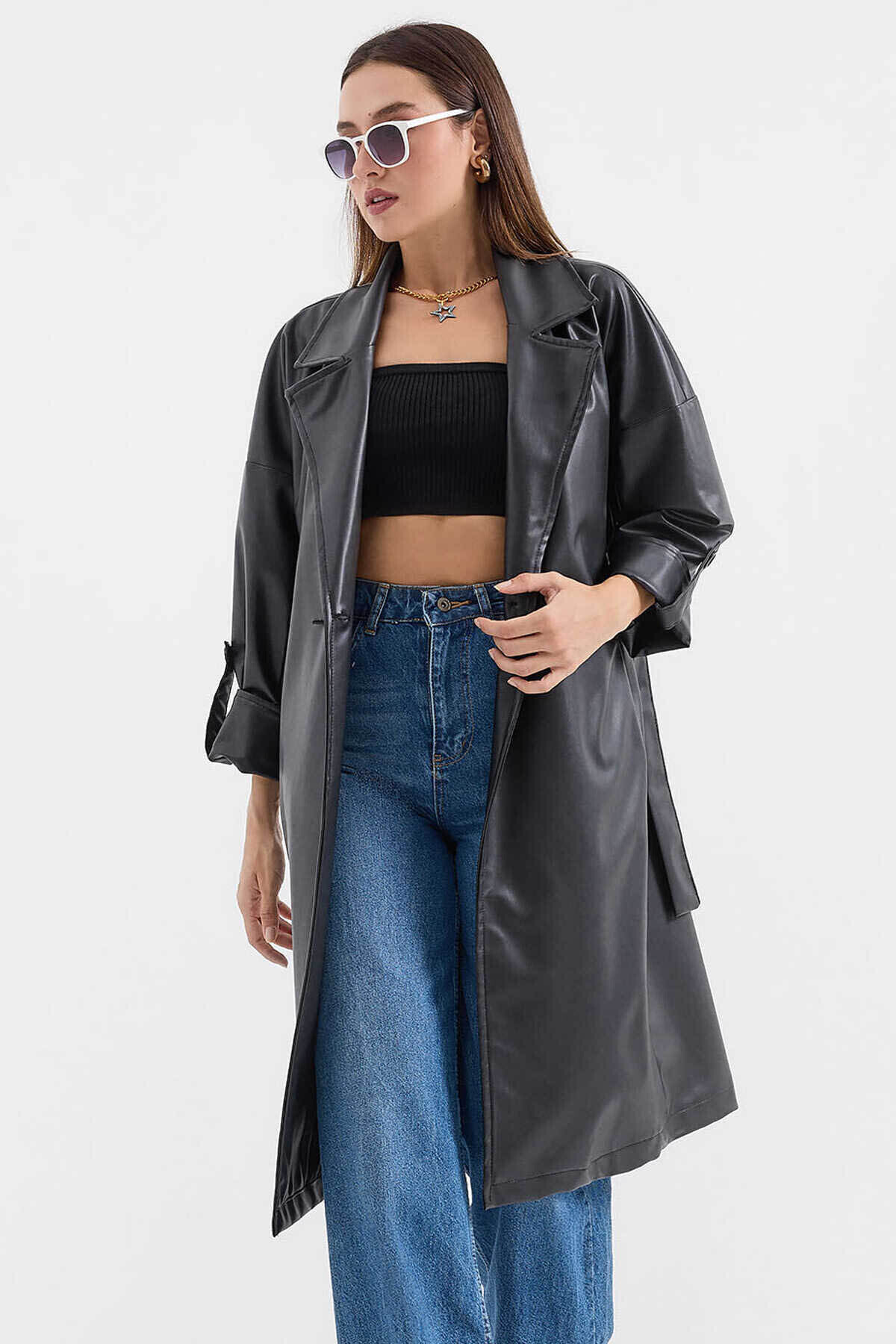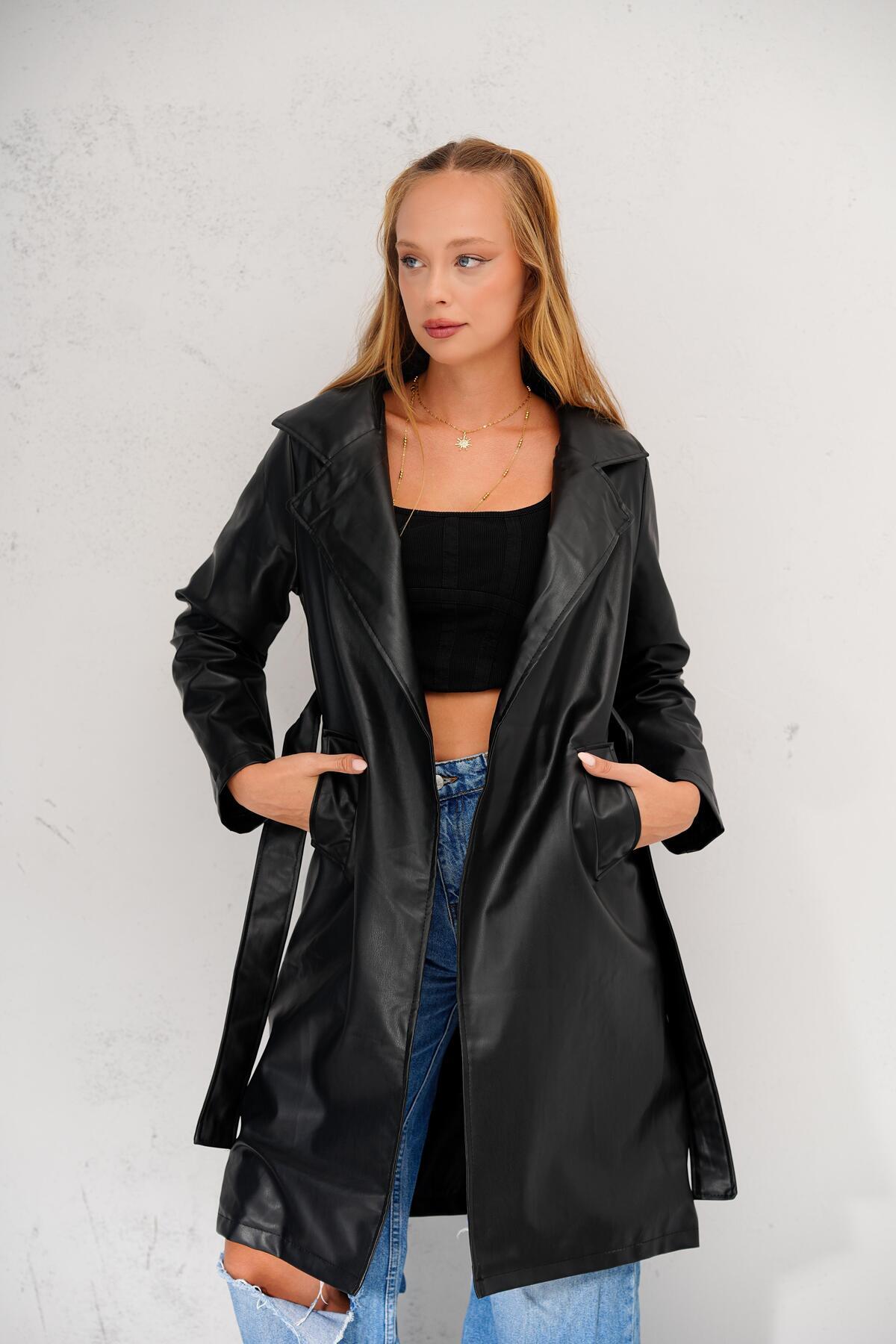 1034 Kuşaklı Suni Deri Trençkot - Siyah 1034 Kuşaklı Suni Deri Trençkot - Siyah 1034BGD19 42