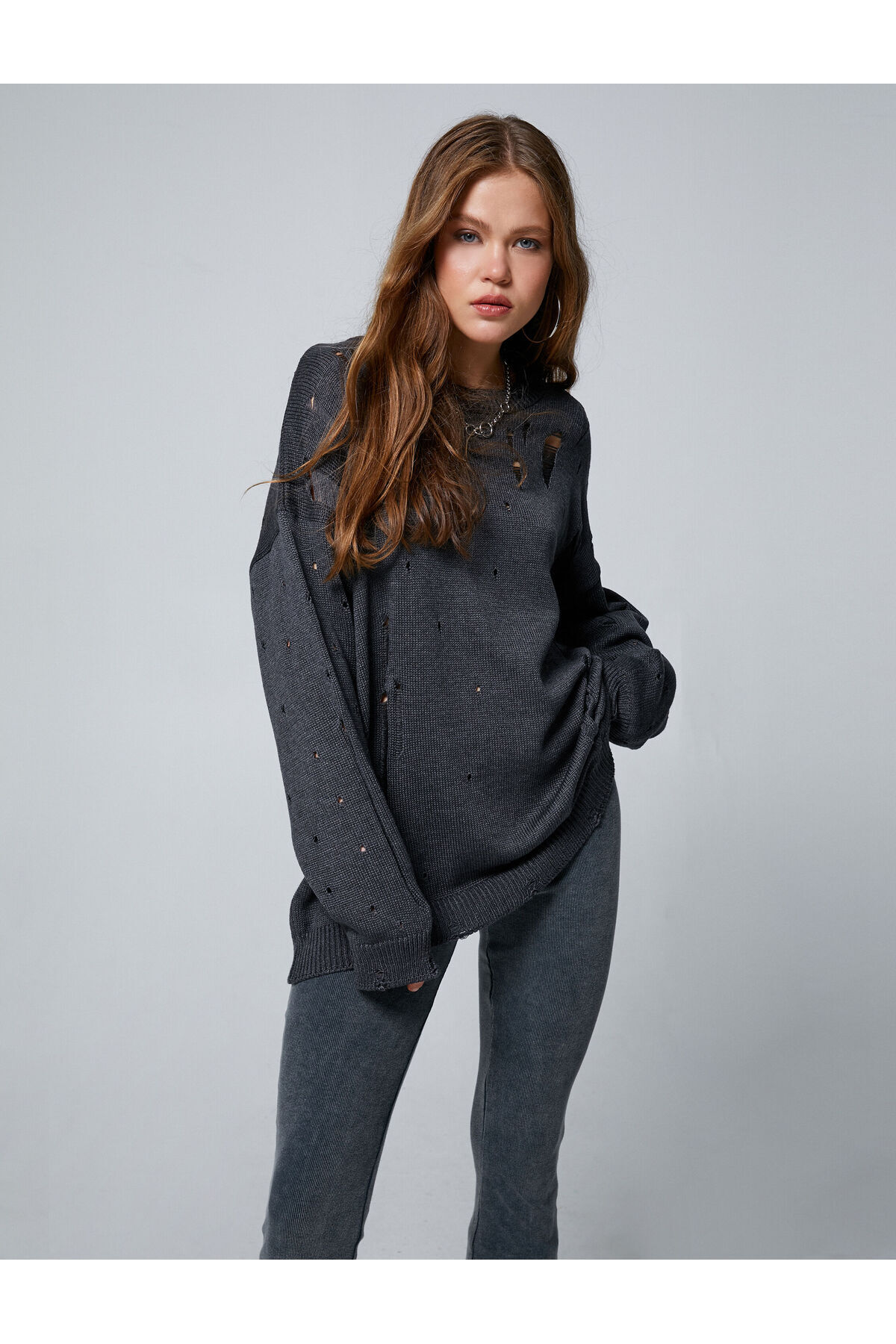 Triko Kazak Uzun Kollu Delikli Yırtık Detaylı Düşük Omuz Bisiklet Yaka Triko Kazak Uzun Kollu Delikli Yırtık Detaylı Düşük Omuz Bisiklet Yaka 4WAL90001IT L