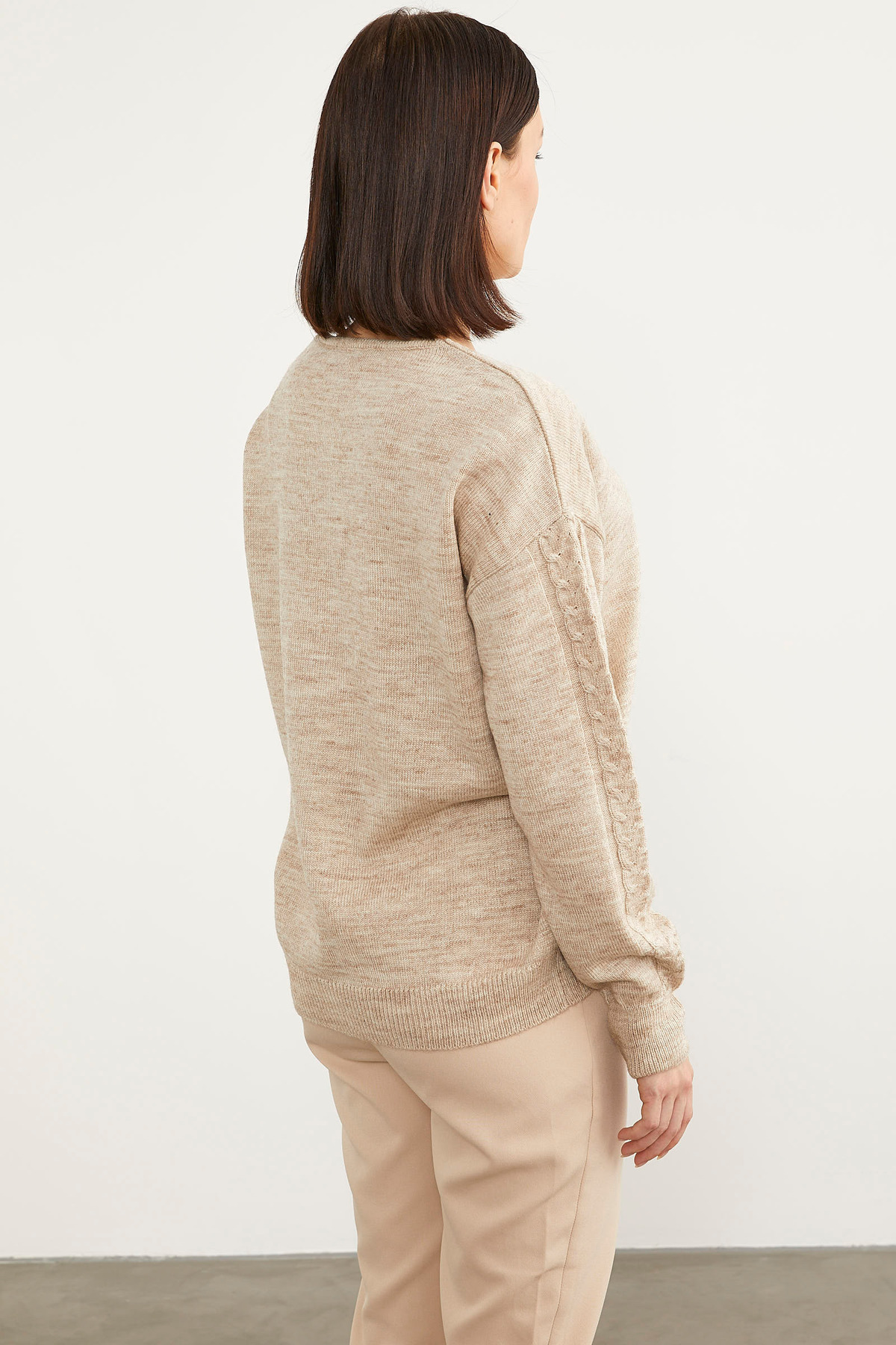 Saç Örgü Detaylı V Yaka Triko Kazak - Bej Saç Örgü Detaylı V Yaka Triko Kazak - Bej 23K2115-32458.0001 L