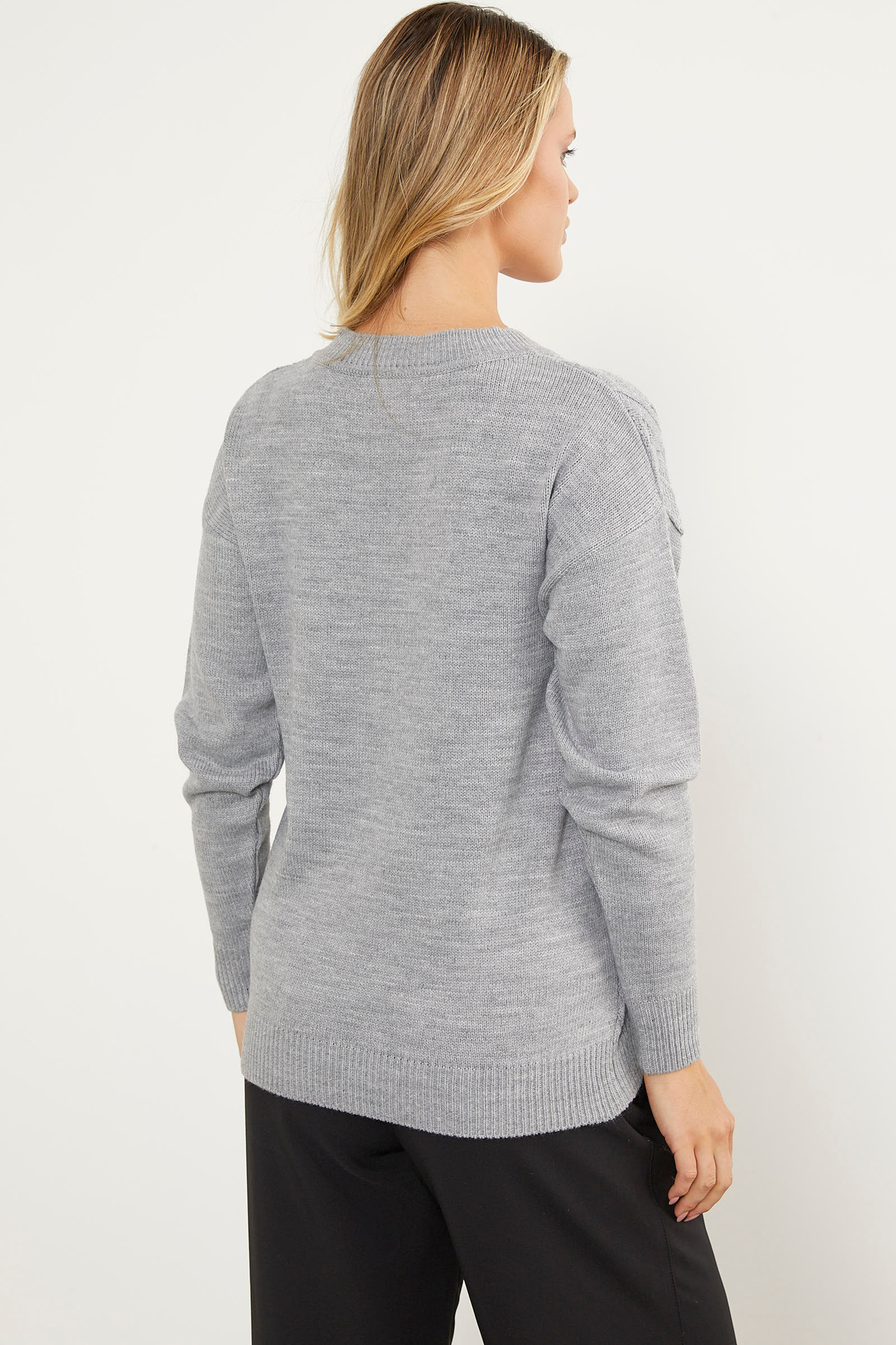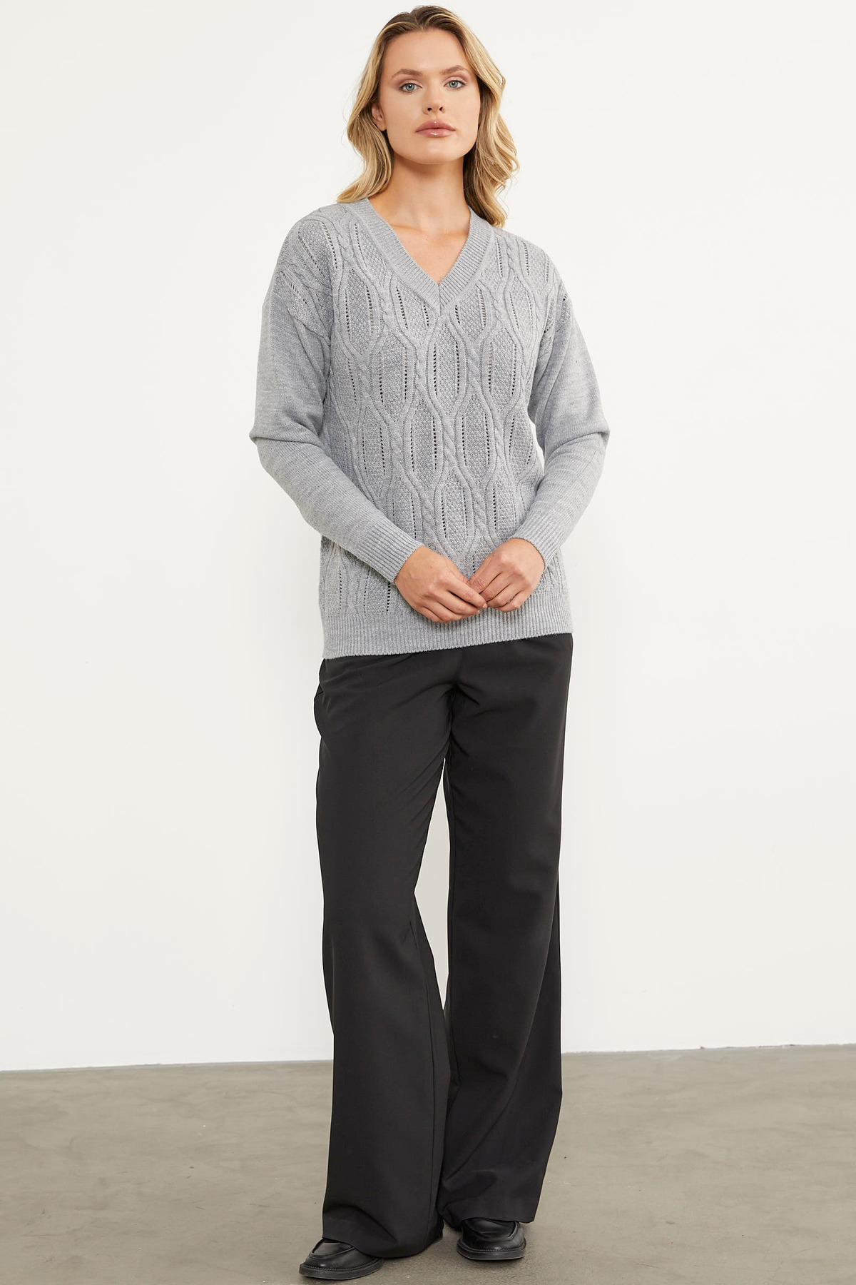 V Yaka Motifli Triko Kazak - Gri V Yaka Motifli Triko Kazak - Gri 23K2115-32455.0001 L