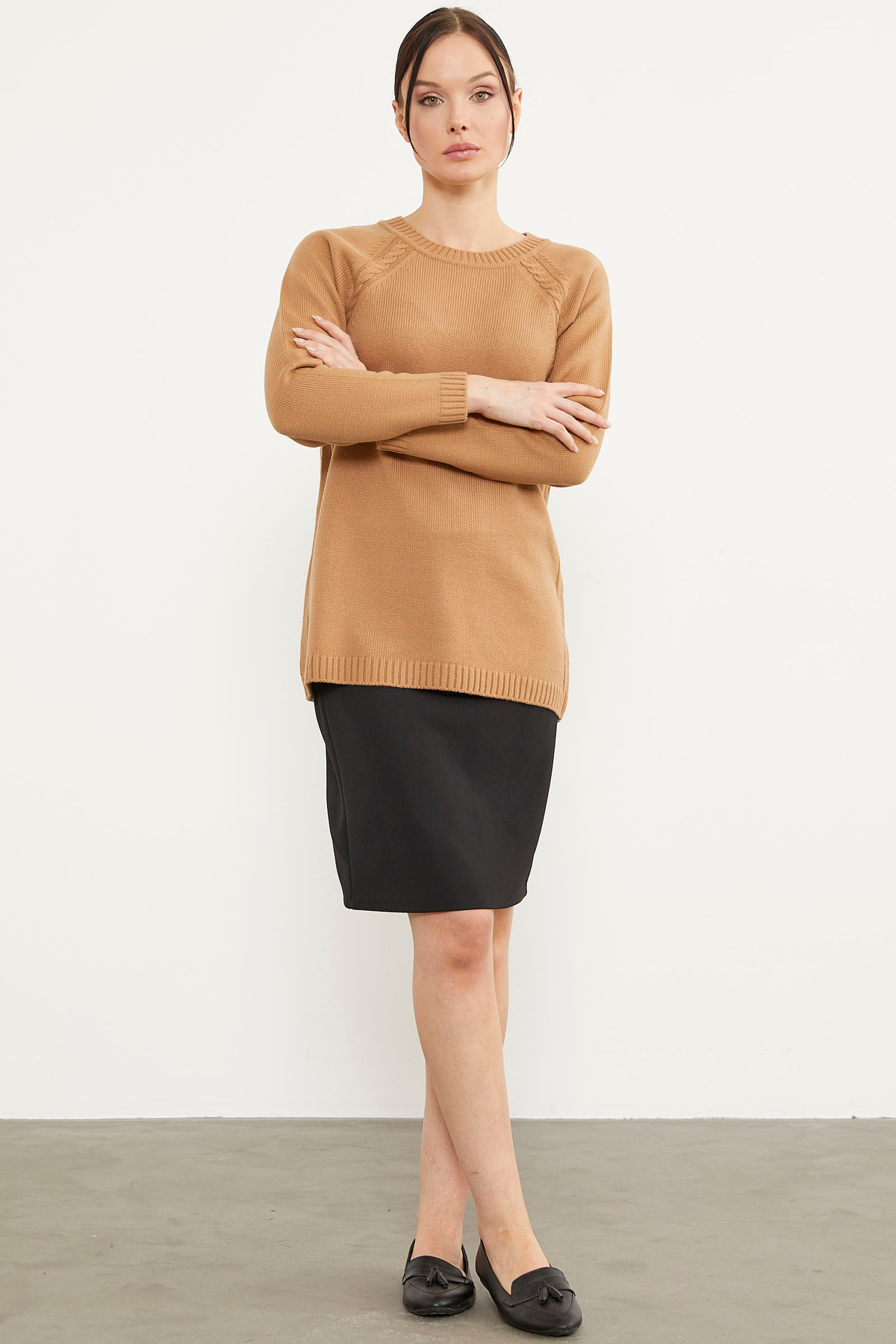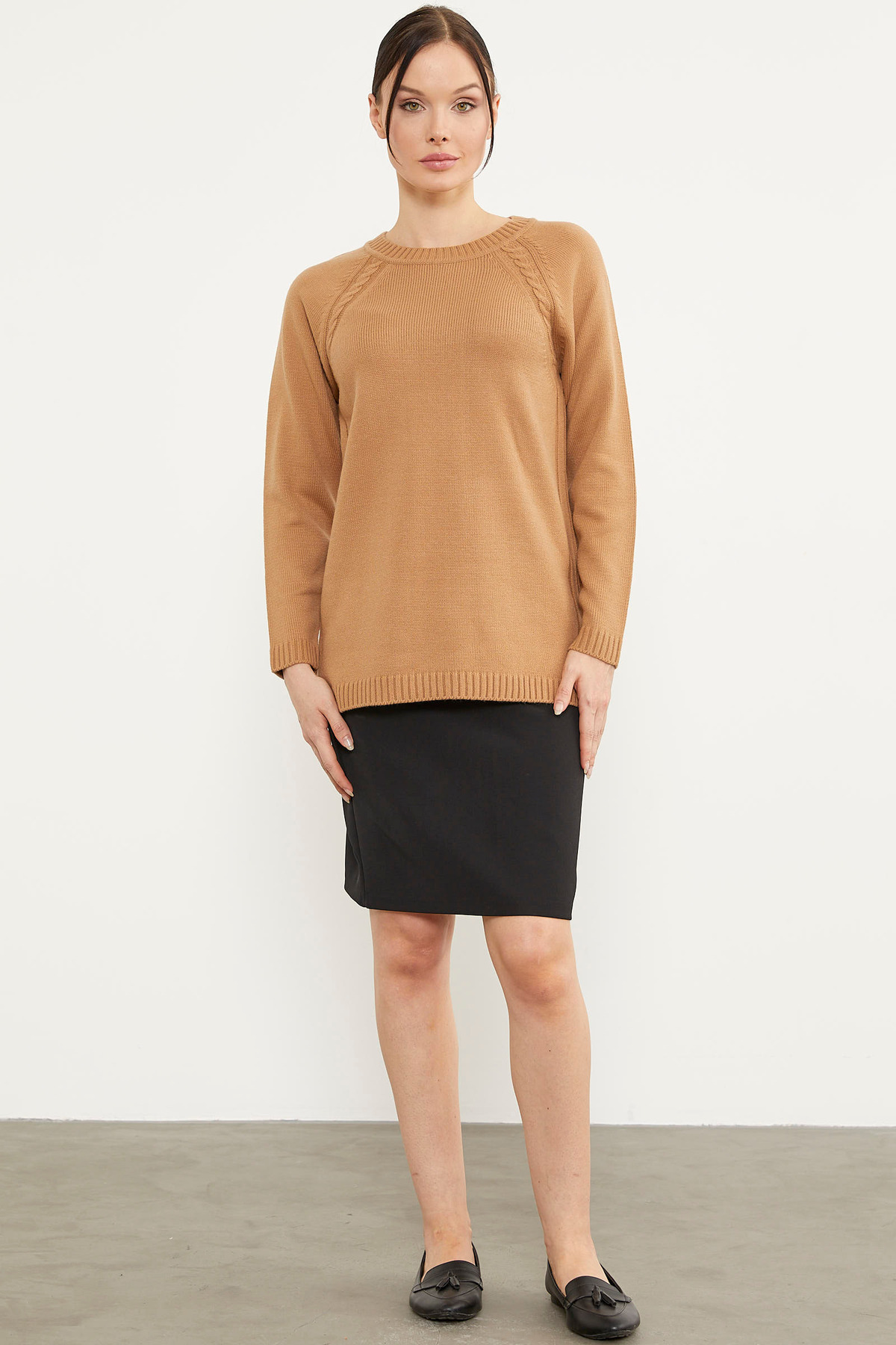 Saç Örgü Detaylı Tunik Triko Kazak - Kamel Saç Örgü Detaylı Tunik Triko Kazak - Kamel 23K2115-32436.0001 L